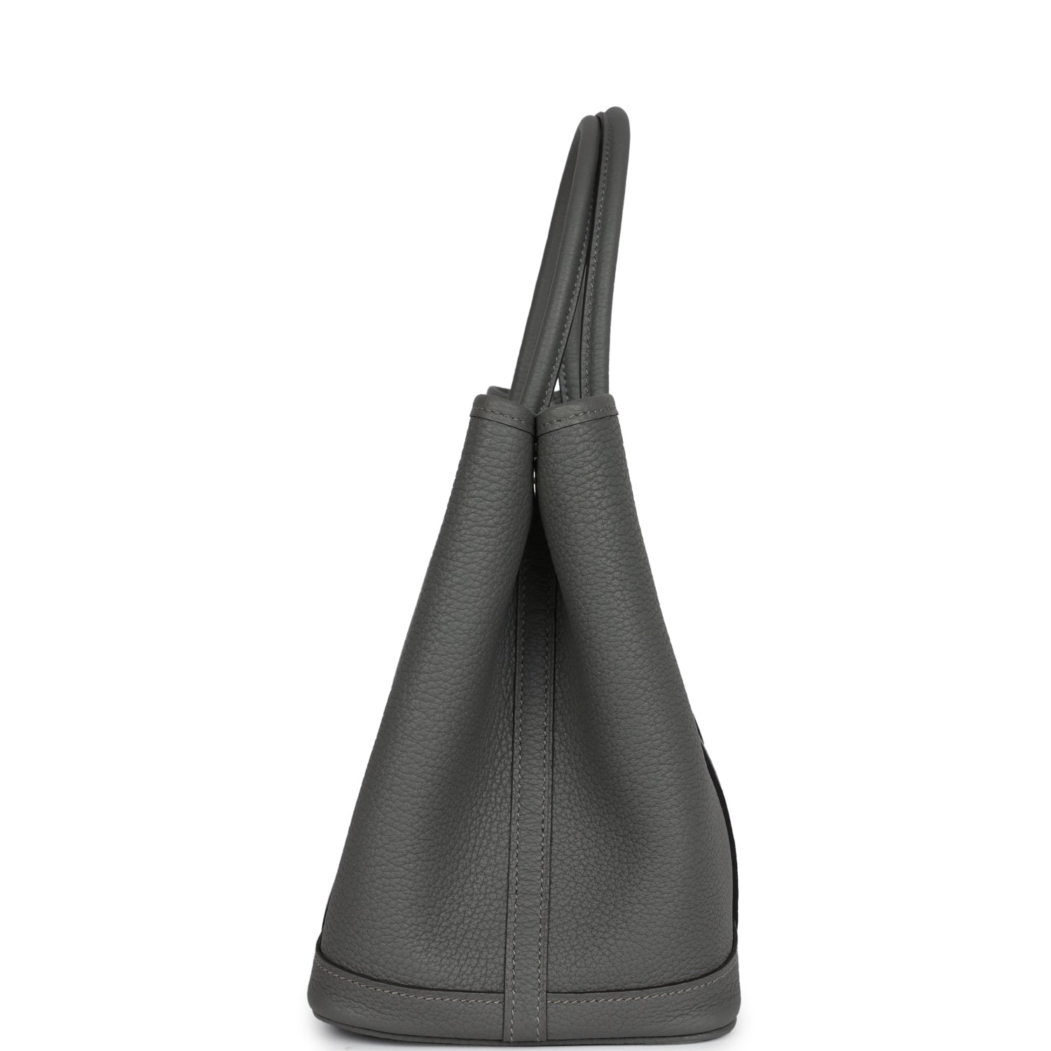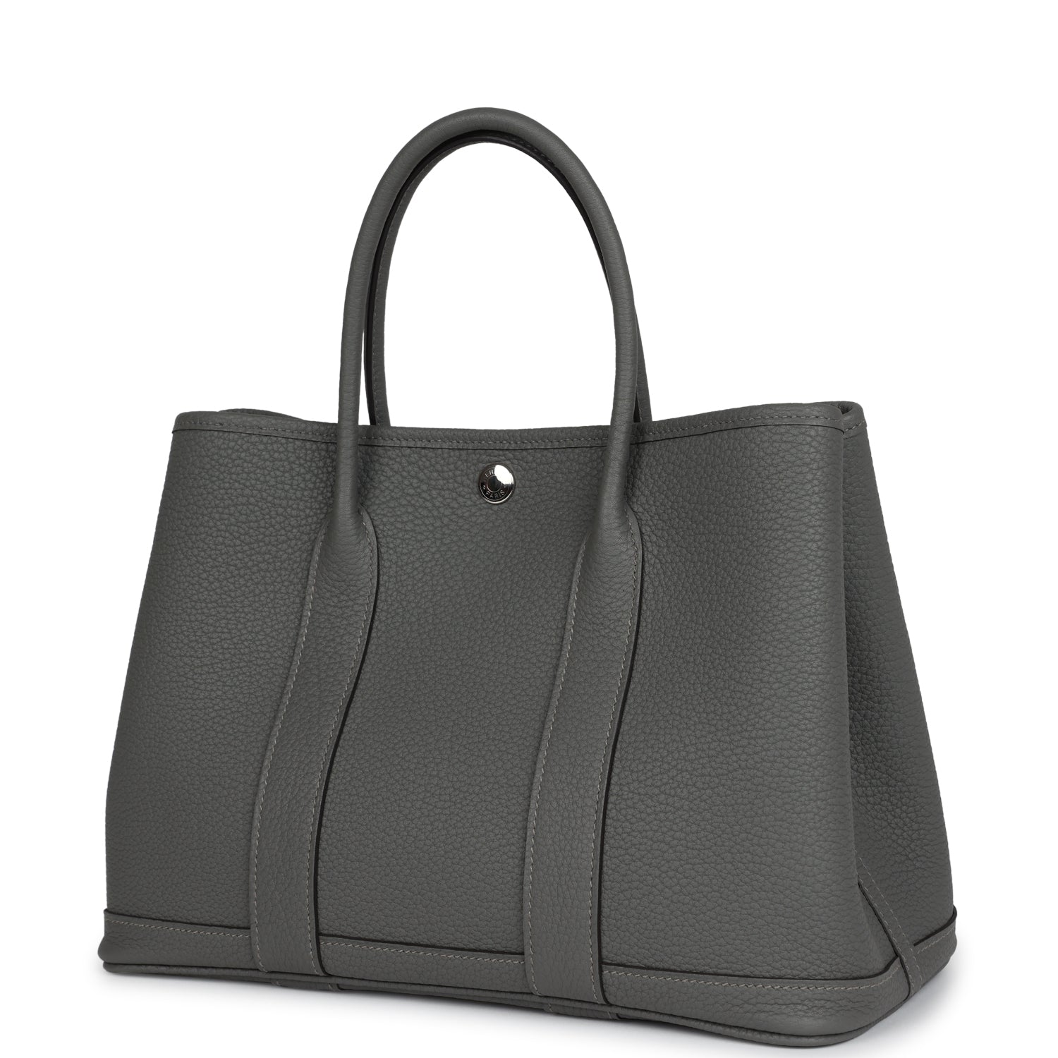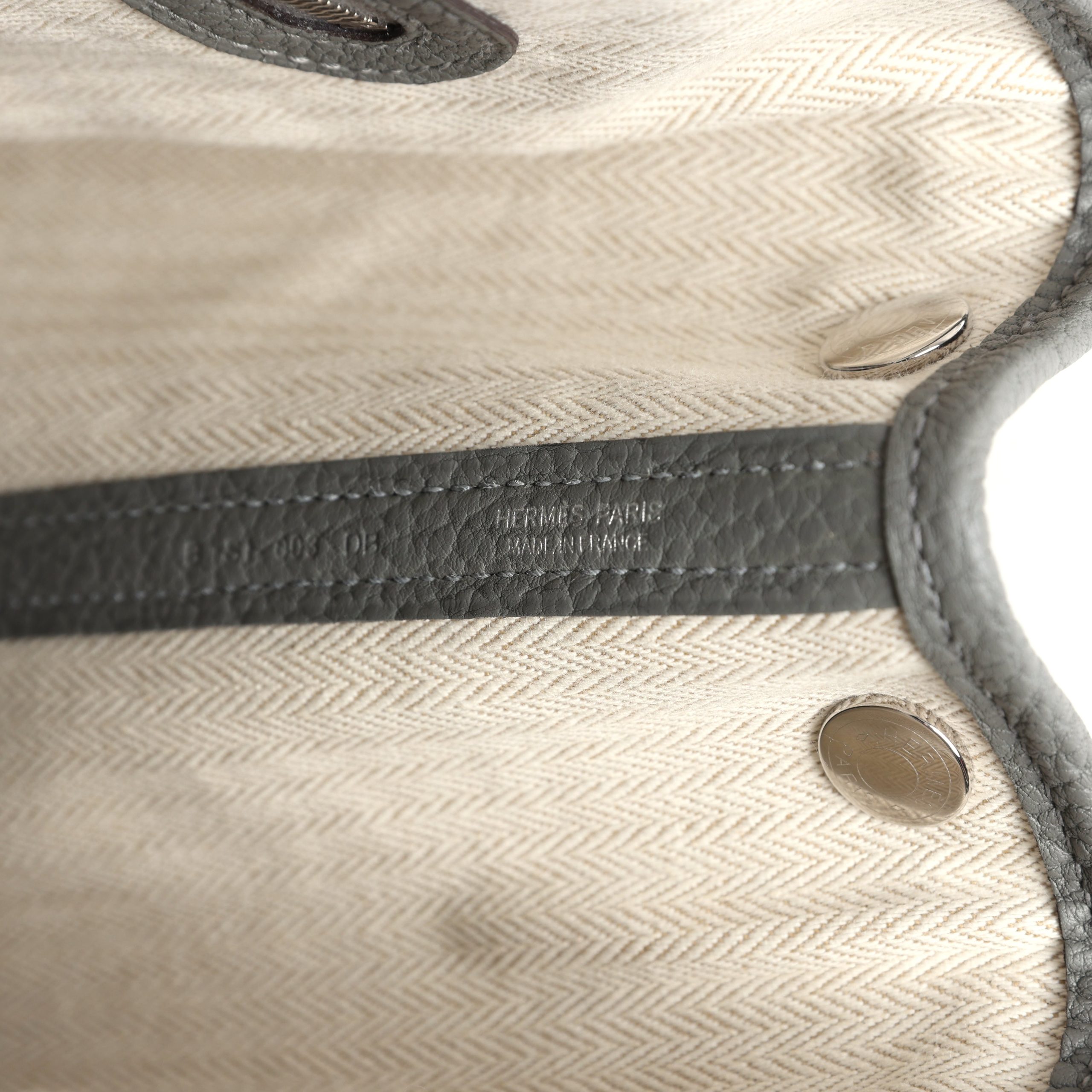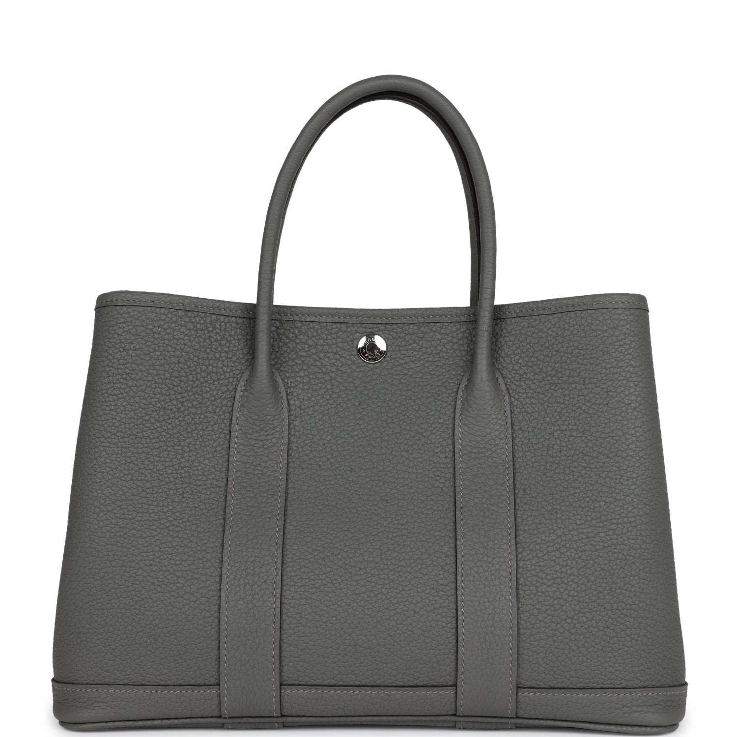 This Garden Party is in Gris Meyer Negonda with palladium plated hardware, features tonal stitching, Clou de Selle snap closure, and double rolled handles.