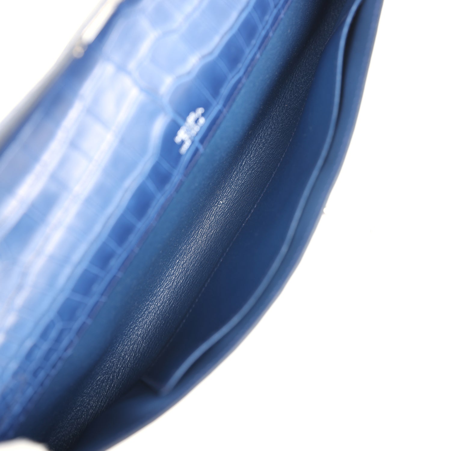 This Kelly Cut is in Bleu De Malte matte porosus crocodile with palladium hardware and has tonal stitching, two straps with front toggle closure and a top flat handle.