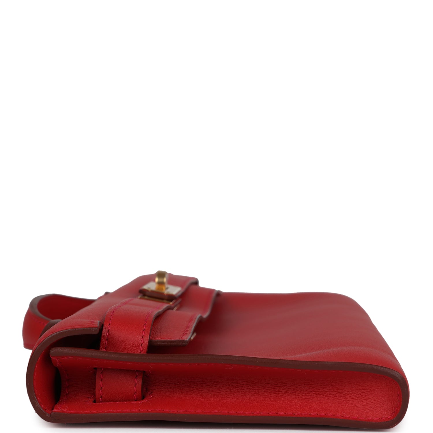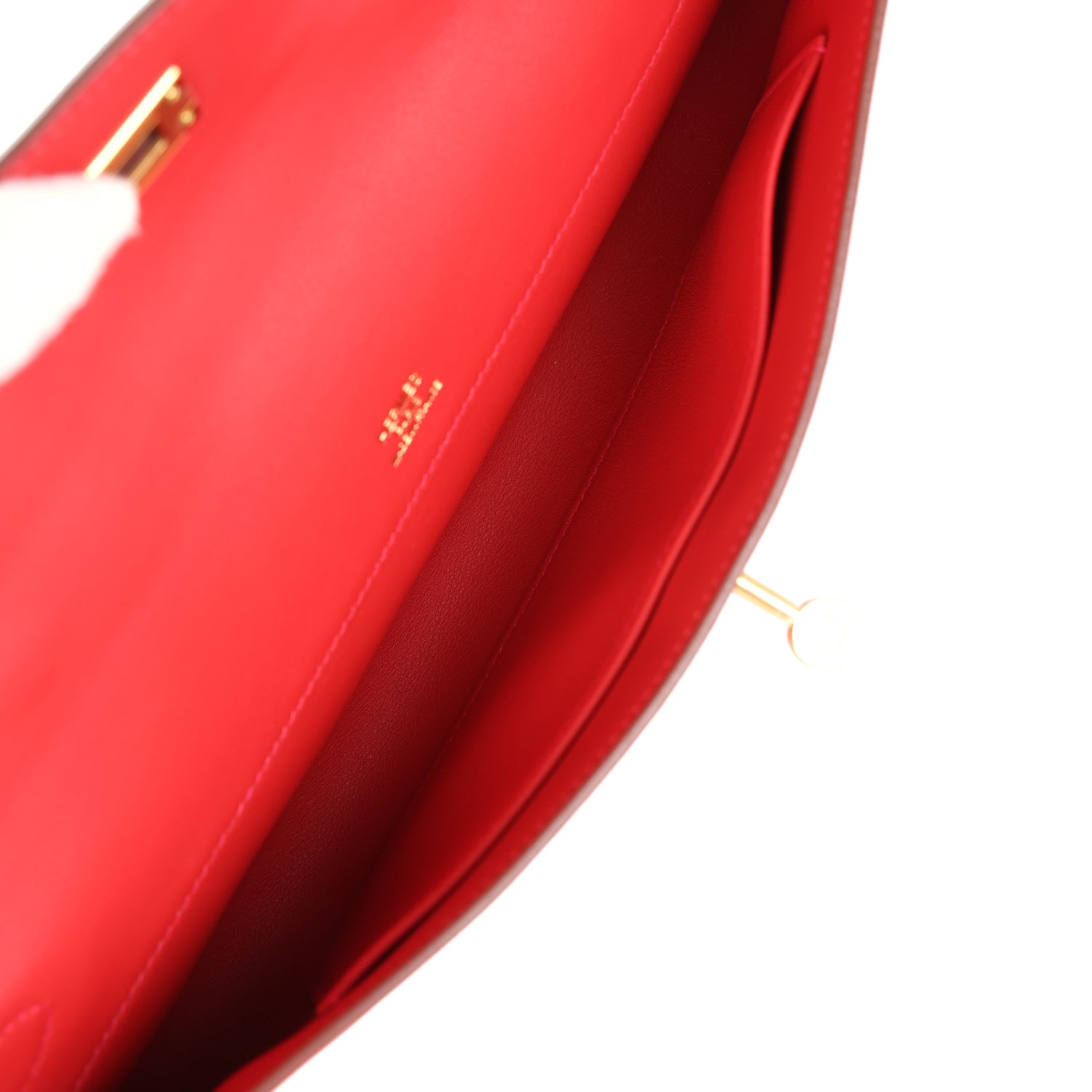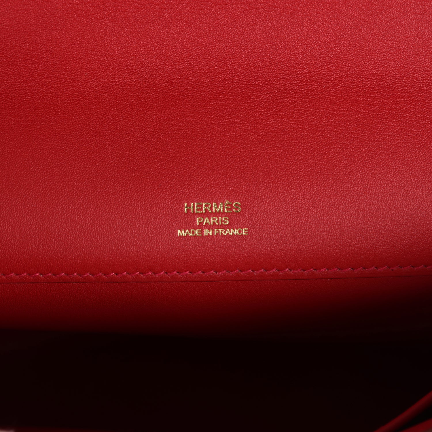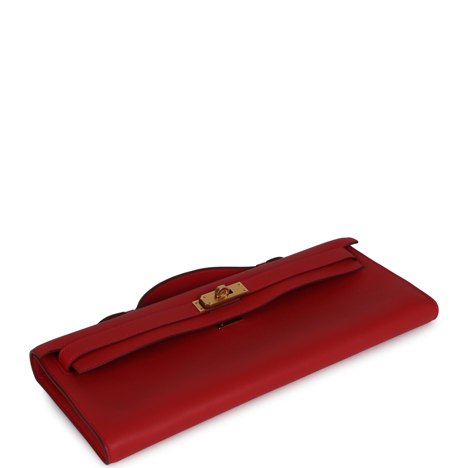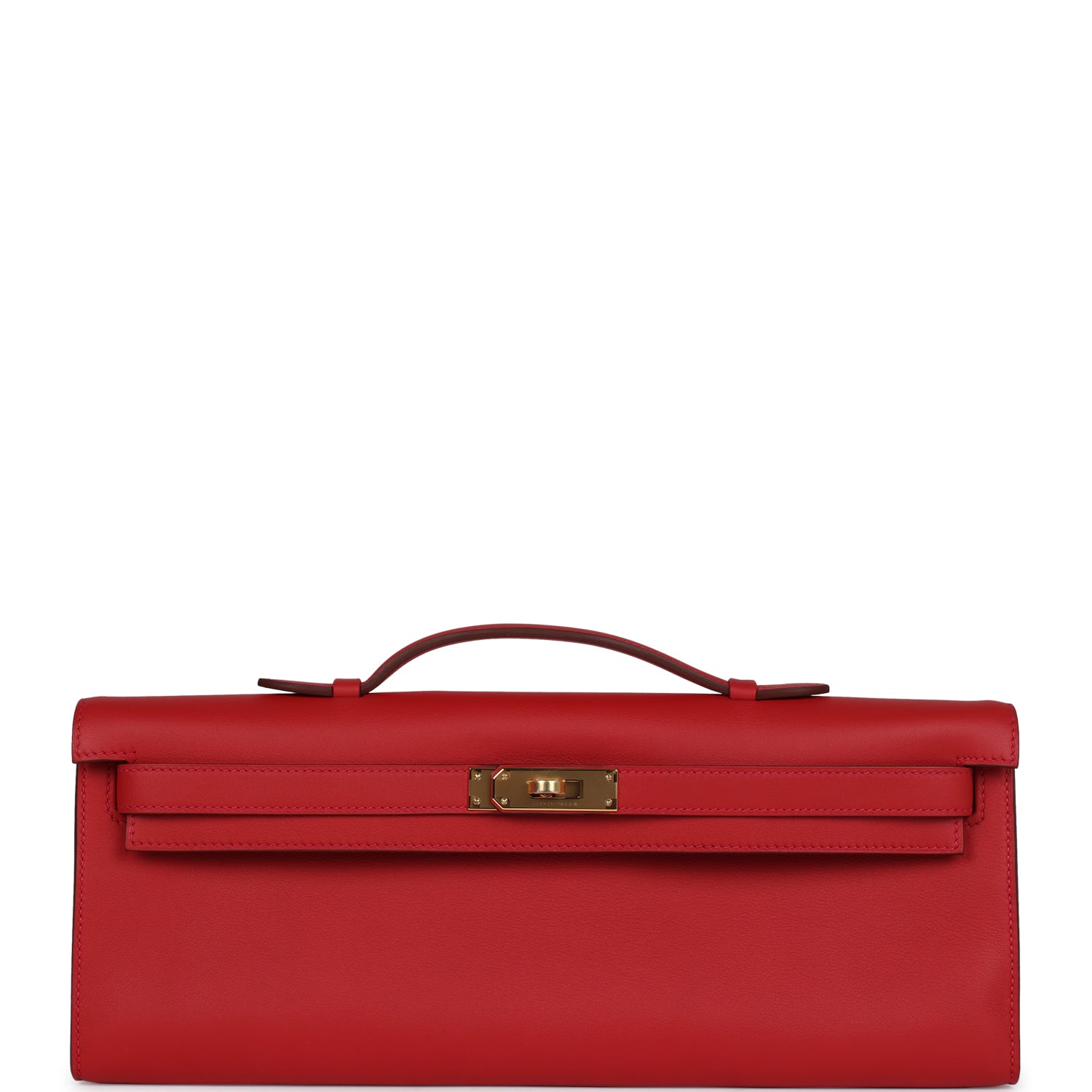 This Kelly Cut is in Rouge Casaque swift leather with gold hardware and has tonal stitching, two straps with front toggle closure and a top flat handle.
