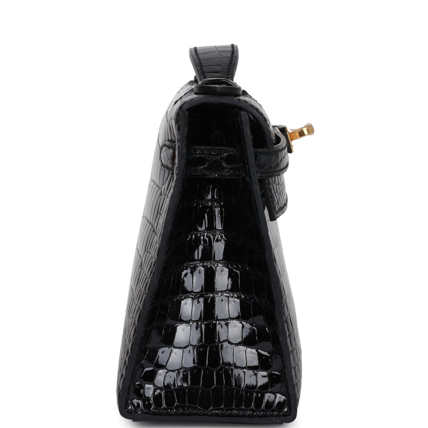 This Kelly Pochette is in Black shiny Porosus Crocodile with gold hardware and has tonal stitching, front flap with two straps, toggle closure and single flat handle.
