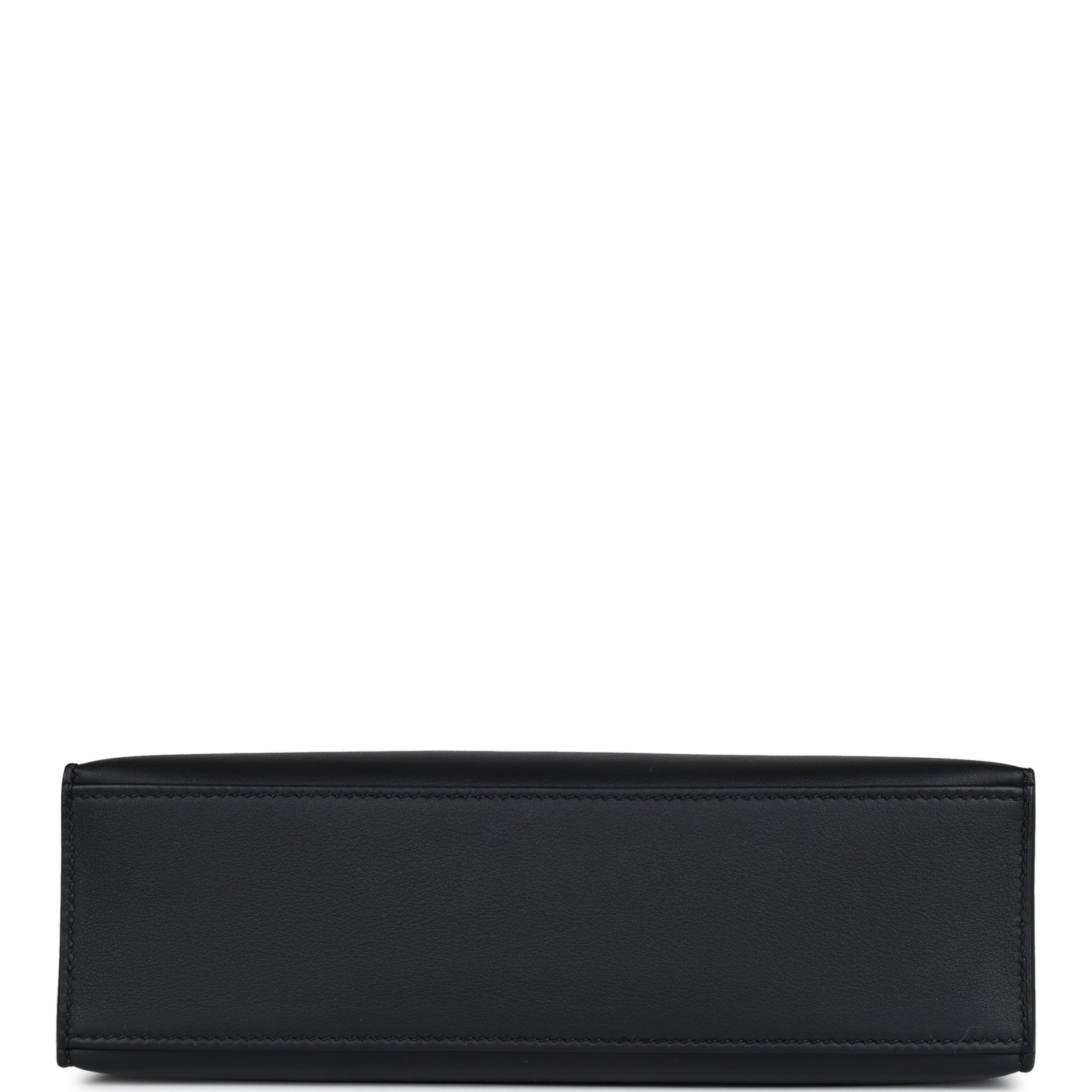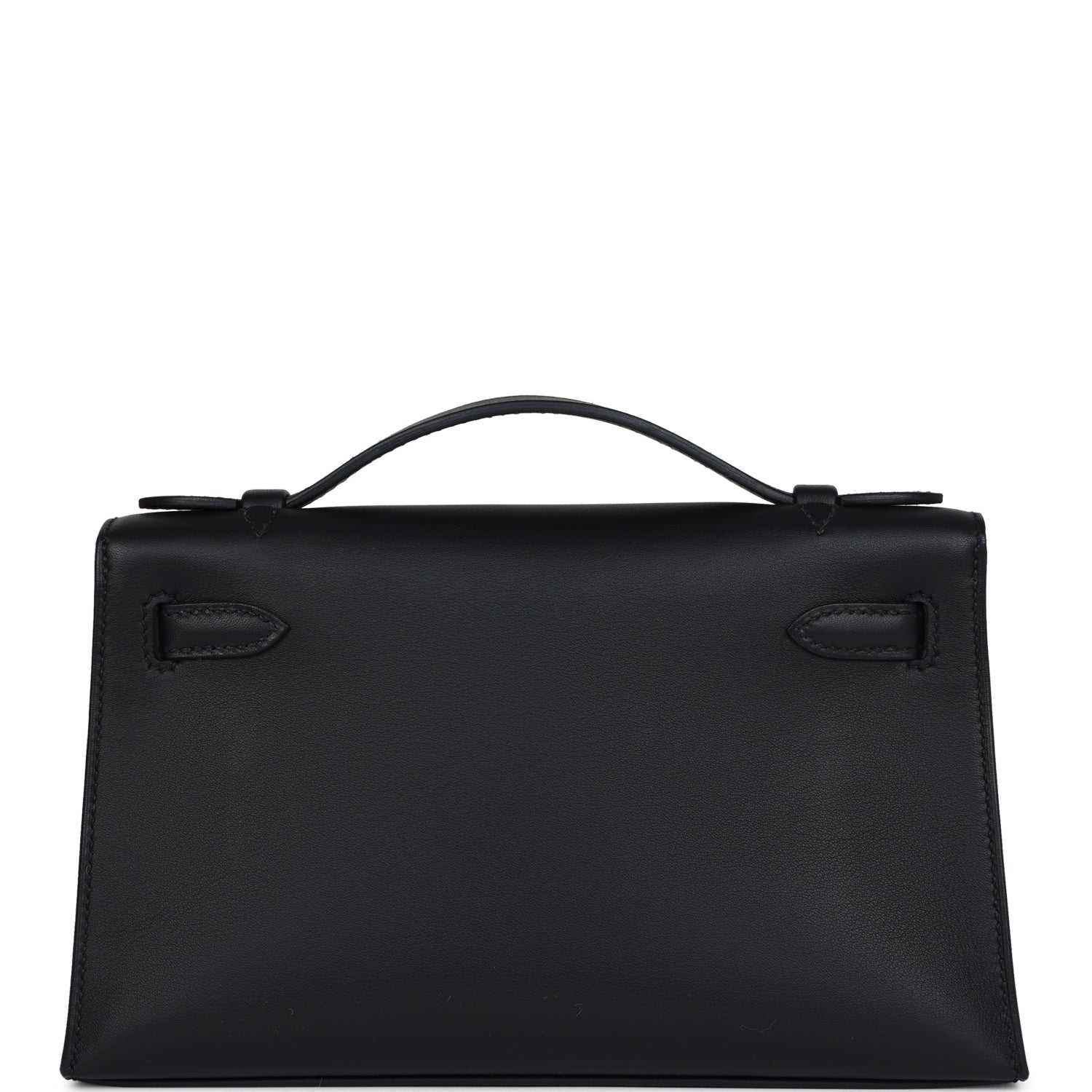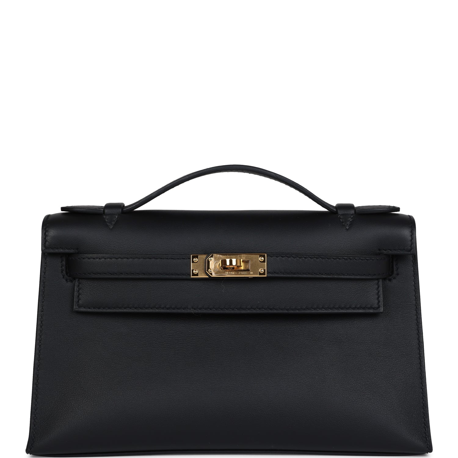 This Kelly Pochette is in Black swift leather with gold hardware and has tonal stitching, front flap, two straps with center toggle closure and a top flat handle.