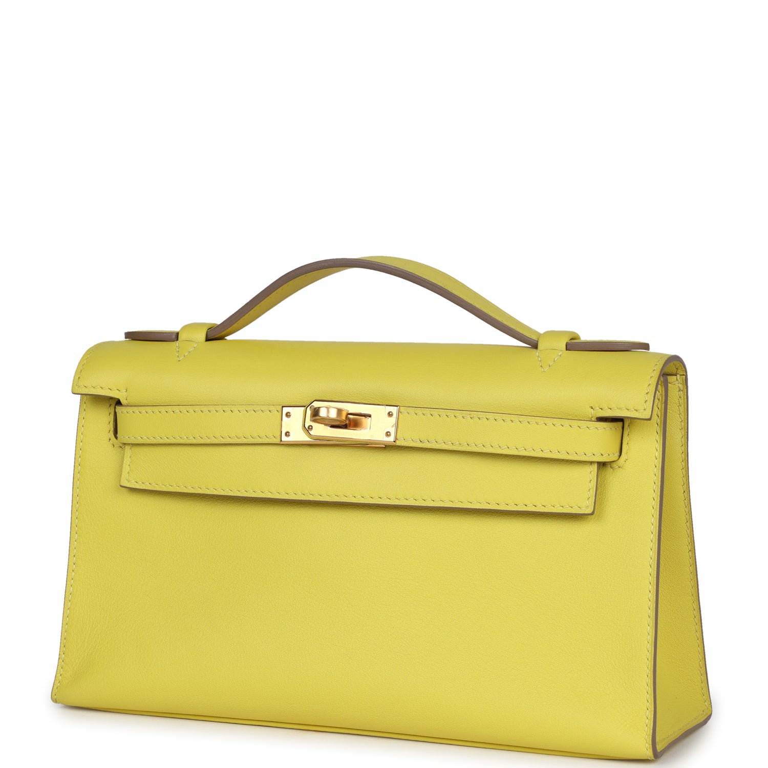 This Kelly Pochette is in Lime swift leather with gold hardware and has tonal stitching, front flap, two straps with center toggle closure and a top flat handle.