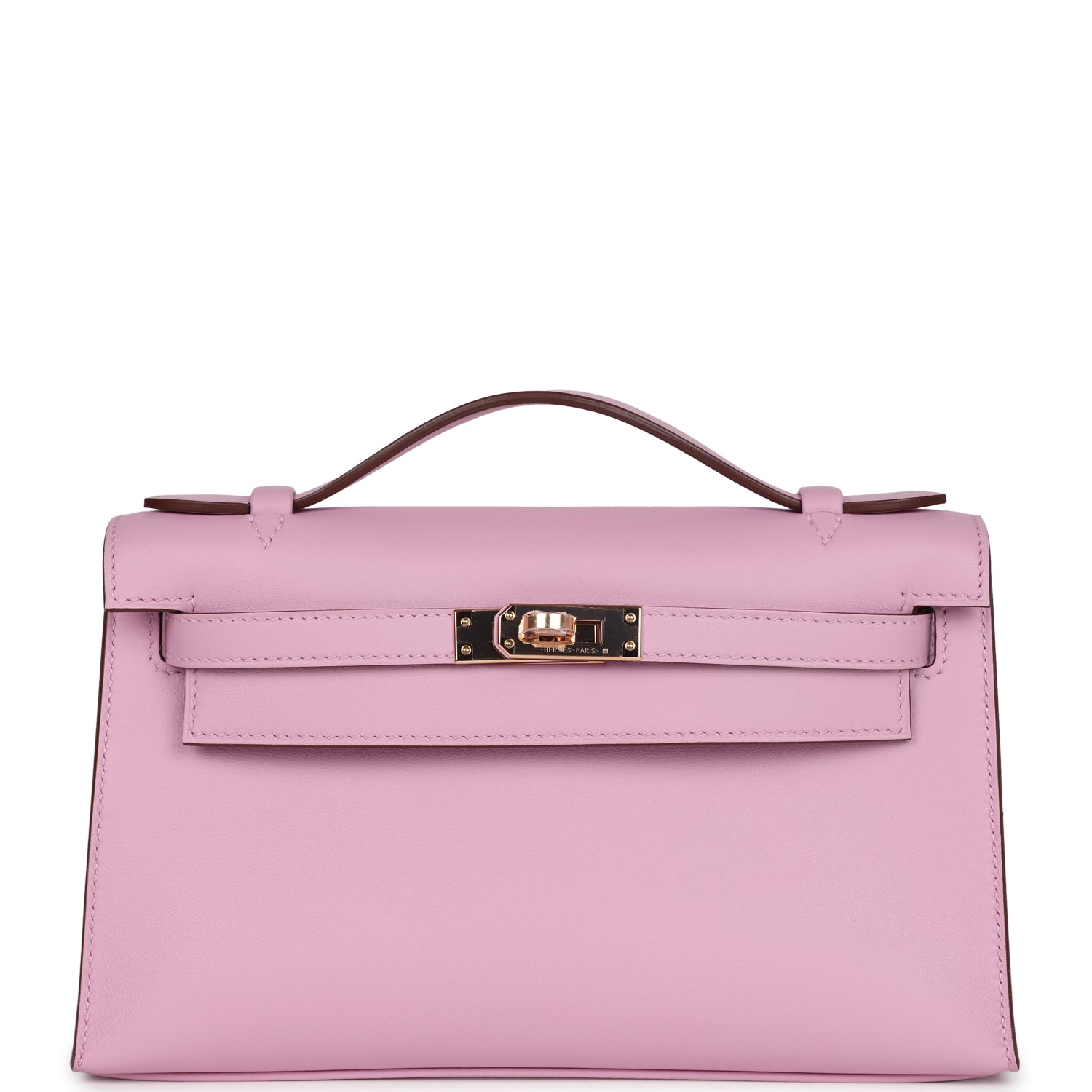 This Kelly Pochette is in Mauve Sylvestre swift leather with rose gold hardware and has tonal stitching, front flap, two straps with center toggle closure and a top flat handle.