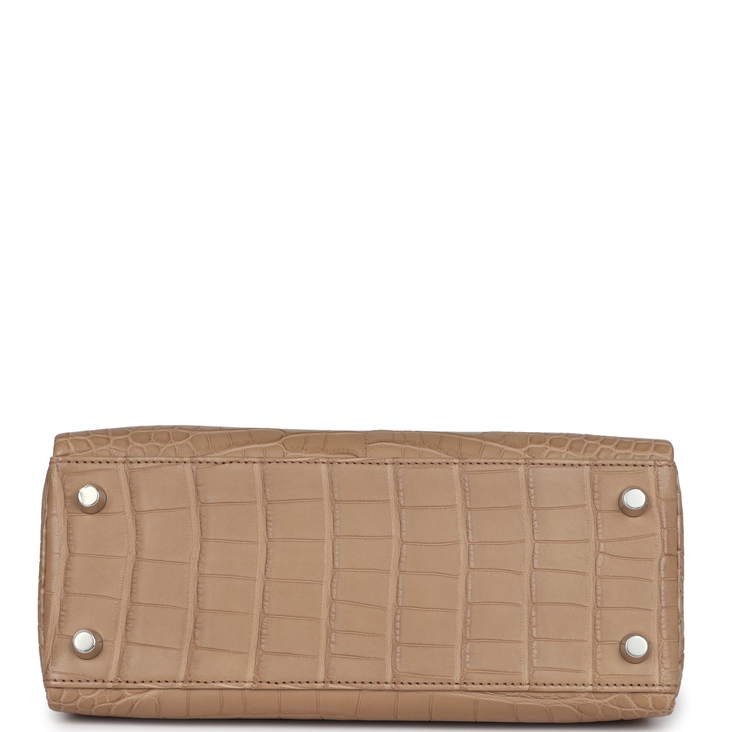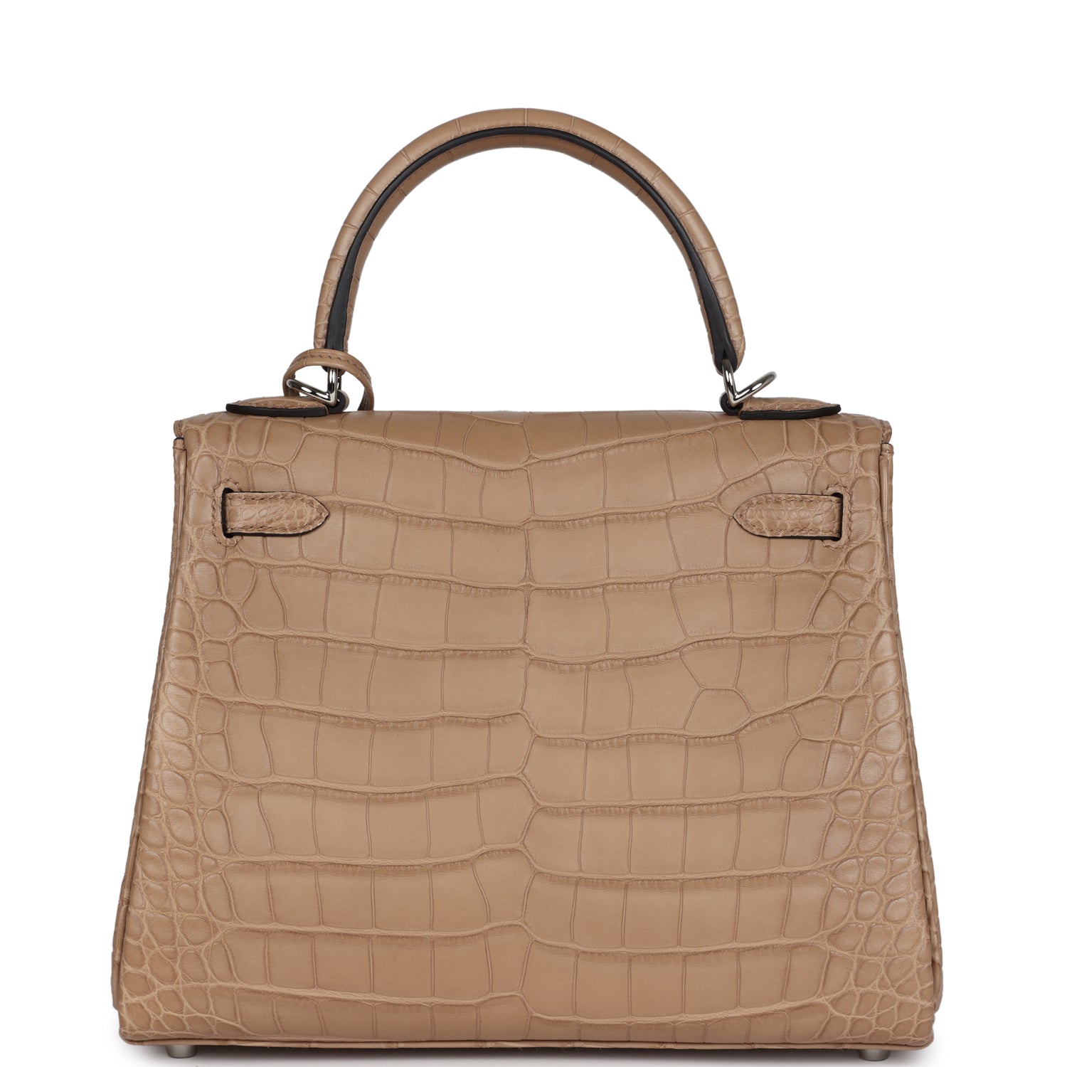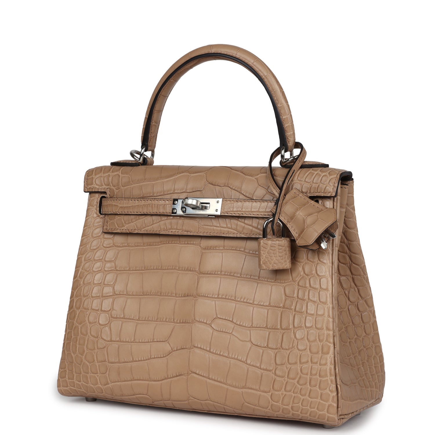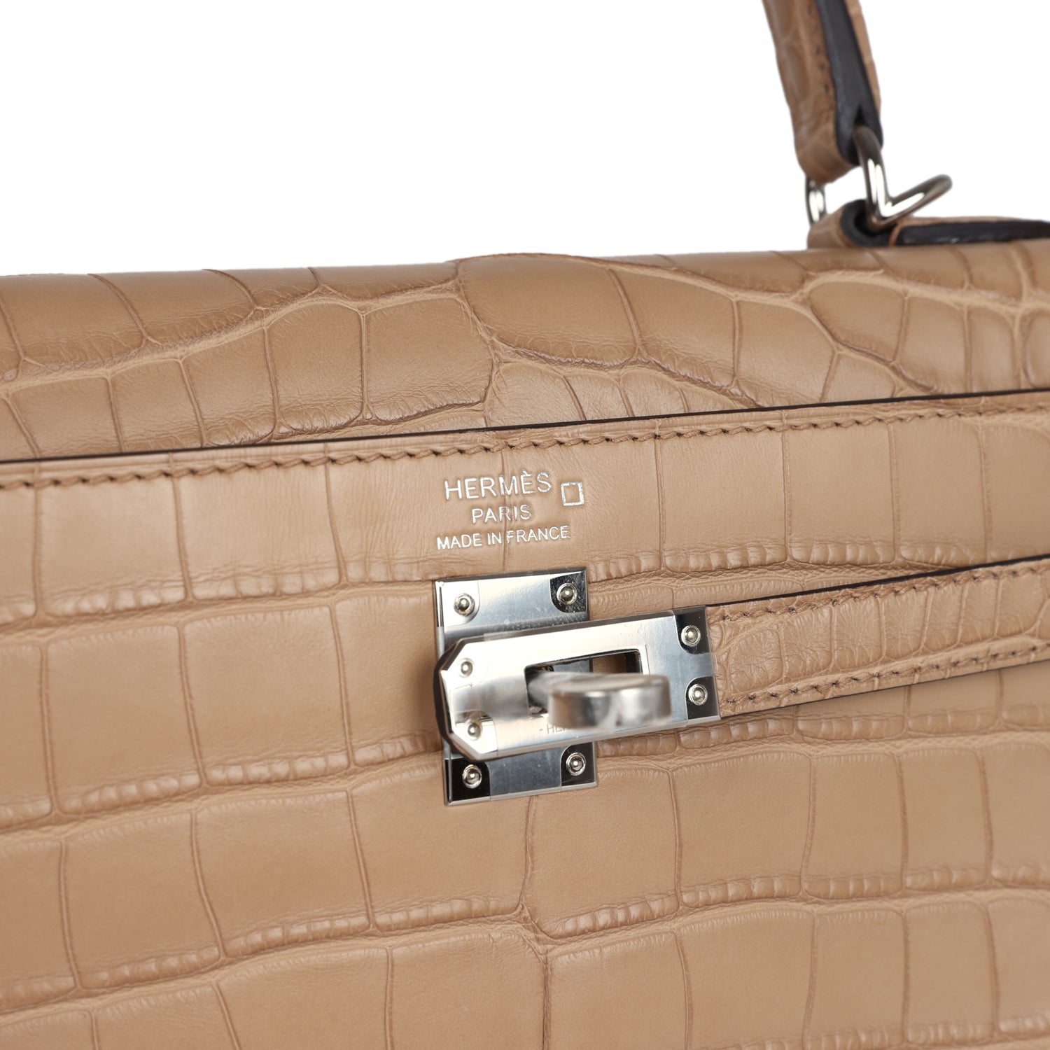 ThisKelly, in theRetourne style,is inChai Matte Alligator Mississippiensis leather with palladium hardware and has tonal stitching, front flap, two straps with center toggle closure, clochette with lock and two keys, single rolled handle and removable strap.