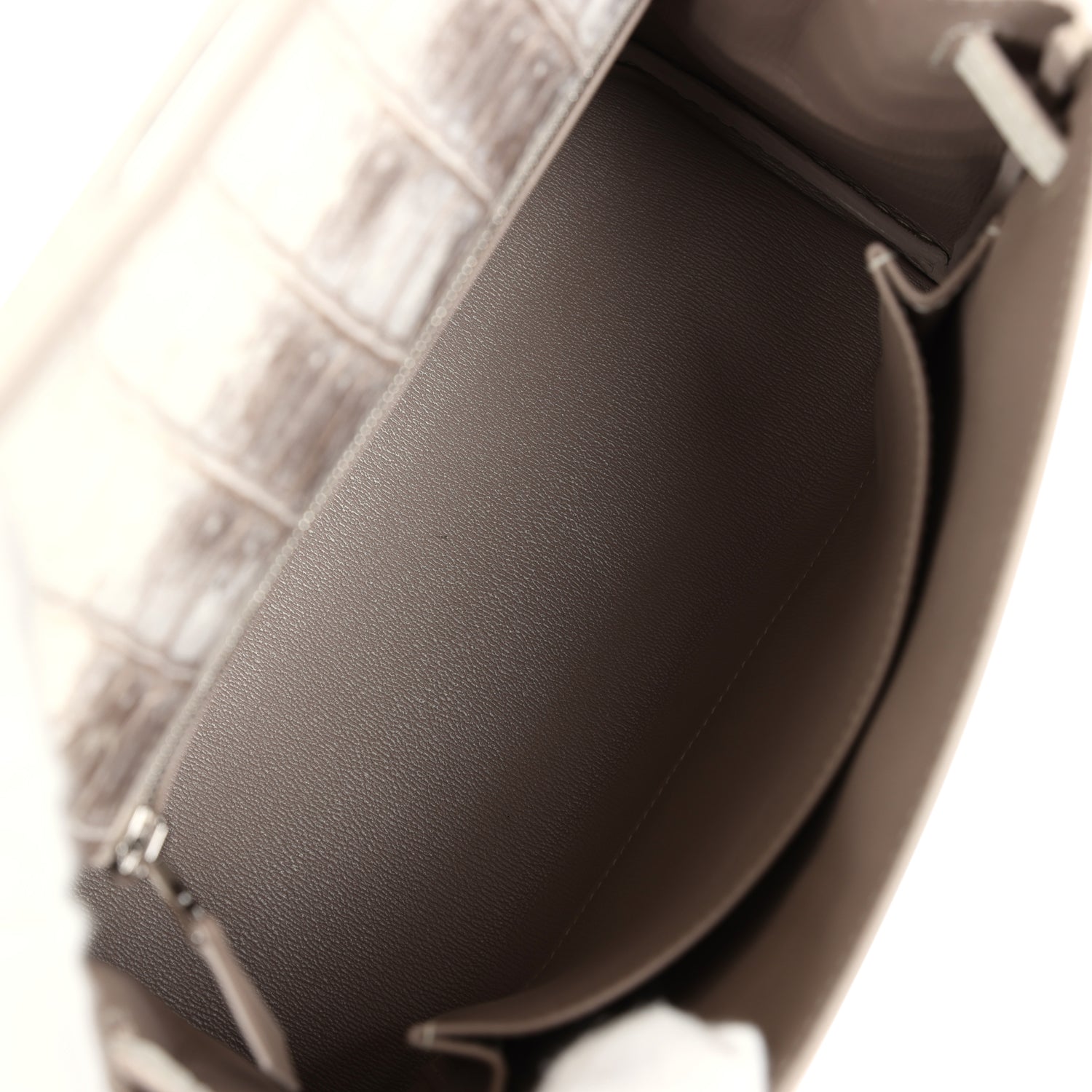 The interior is lined with Gris Tourterelle chevre and has a zip pocket with an Hermès engraved zipper pull and one open pocket on the opposite side.