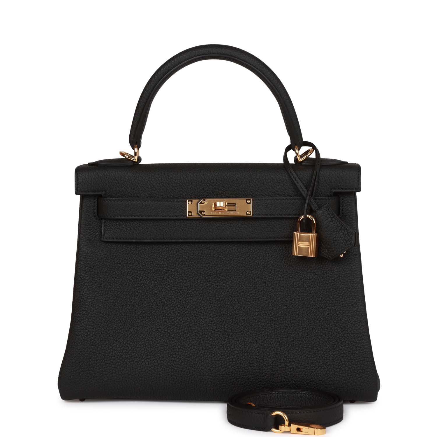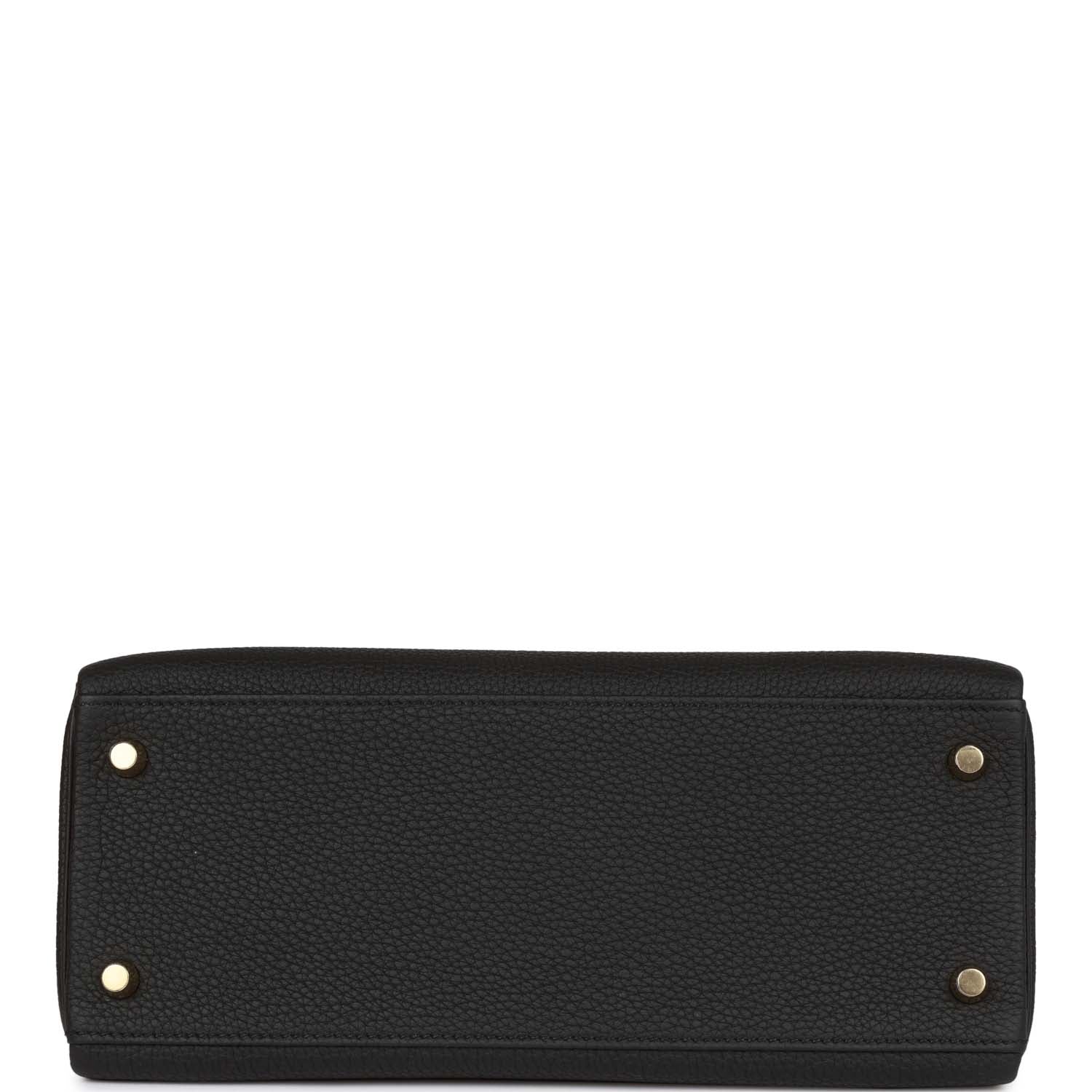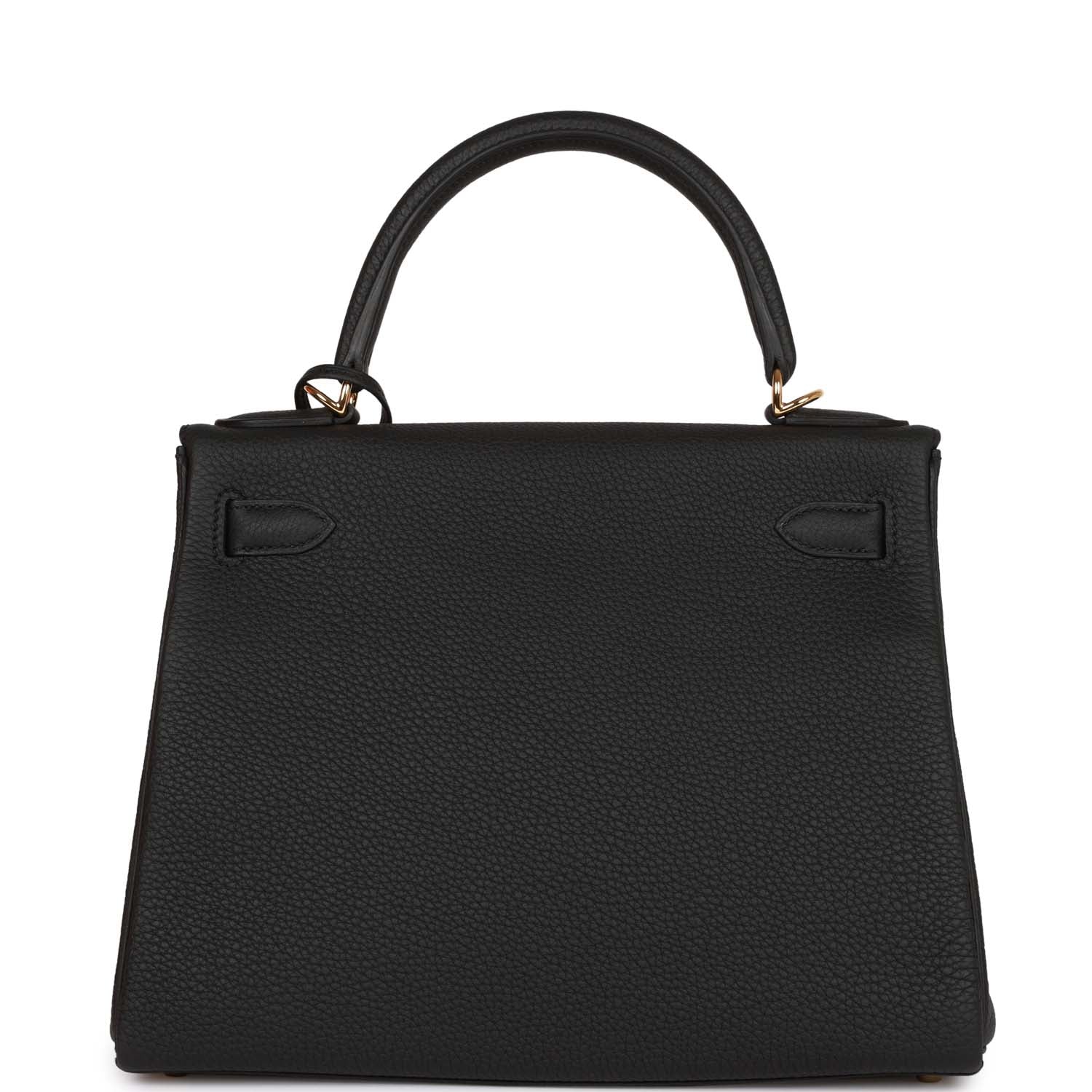 This Kelly, in the Retournestyle, is in Black togo leather with gold hardware and has tonalstitching, front flap, two straps with center toggle closure, clochette with lock and two keys, single rolled handle and removable shoulder strap.