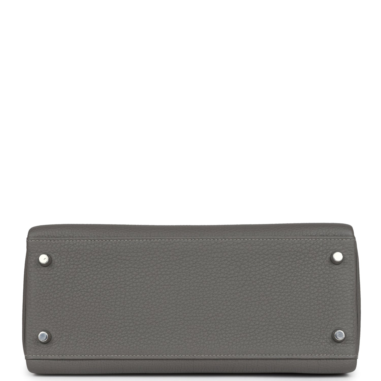 This Kelly, in the Retourne style, is in Gris Meyer togo leather with palladium hardware and has tonal stitching, front flap, two straps with center toggle closure, clochette with lock and two keys, single rolled handle and removable shoulder strap.