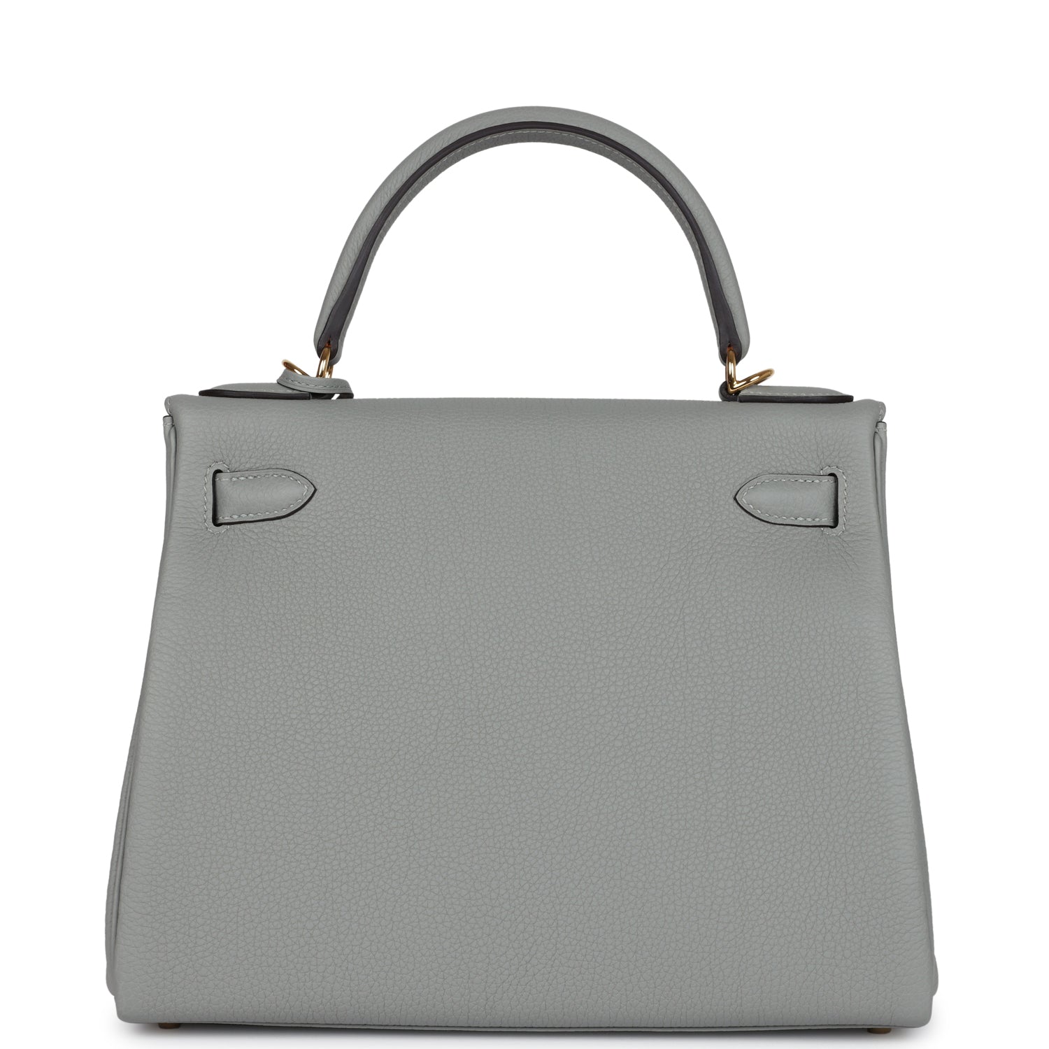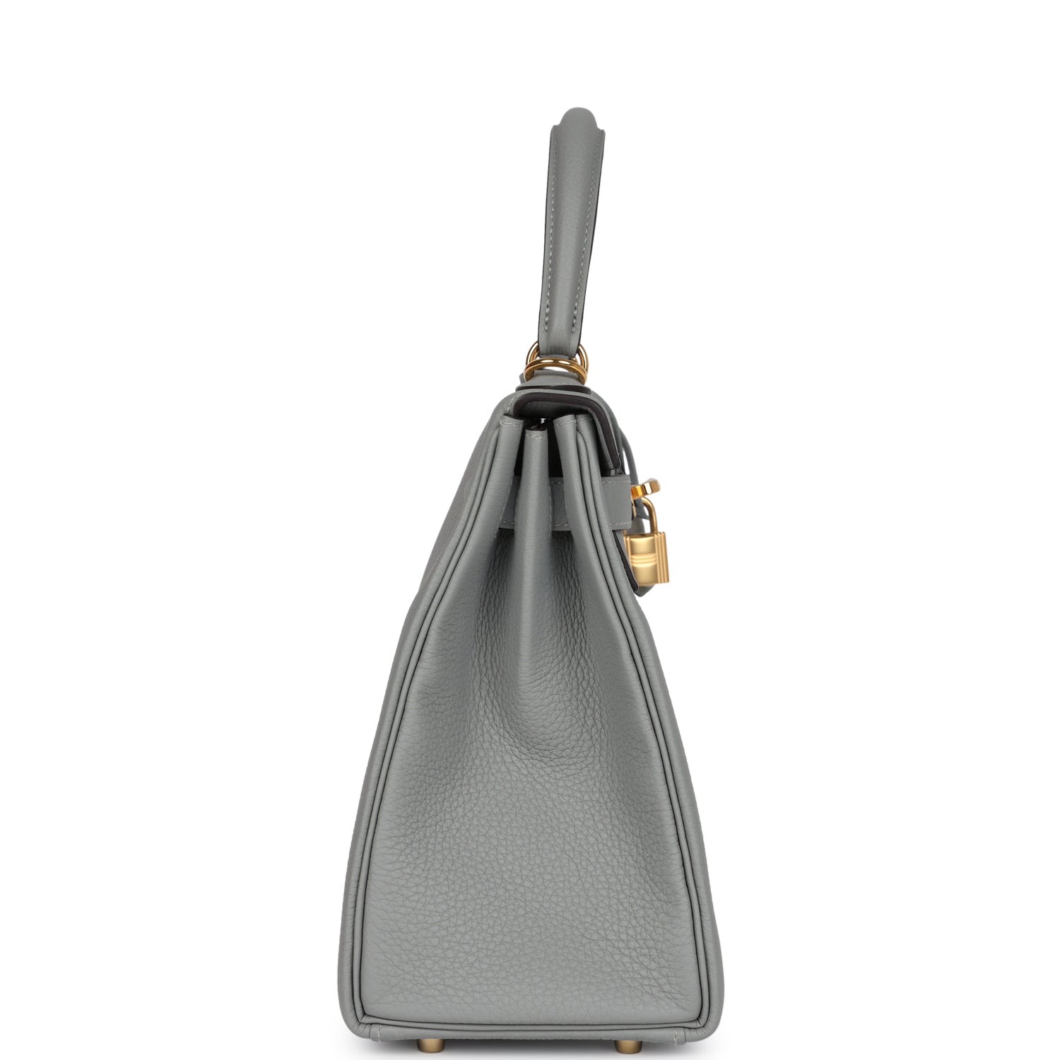 This Kelly, in the Retourne style, is in Gris Mouette togo leather with gold hardware and has tonal stitching, front flap, two straps with center toggle closure, clochette with lock and two keys, single rolled handle and removable shoulder strap.