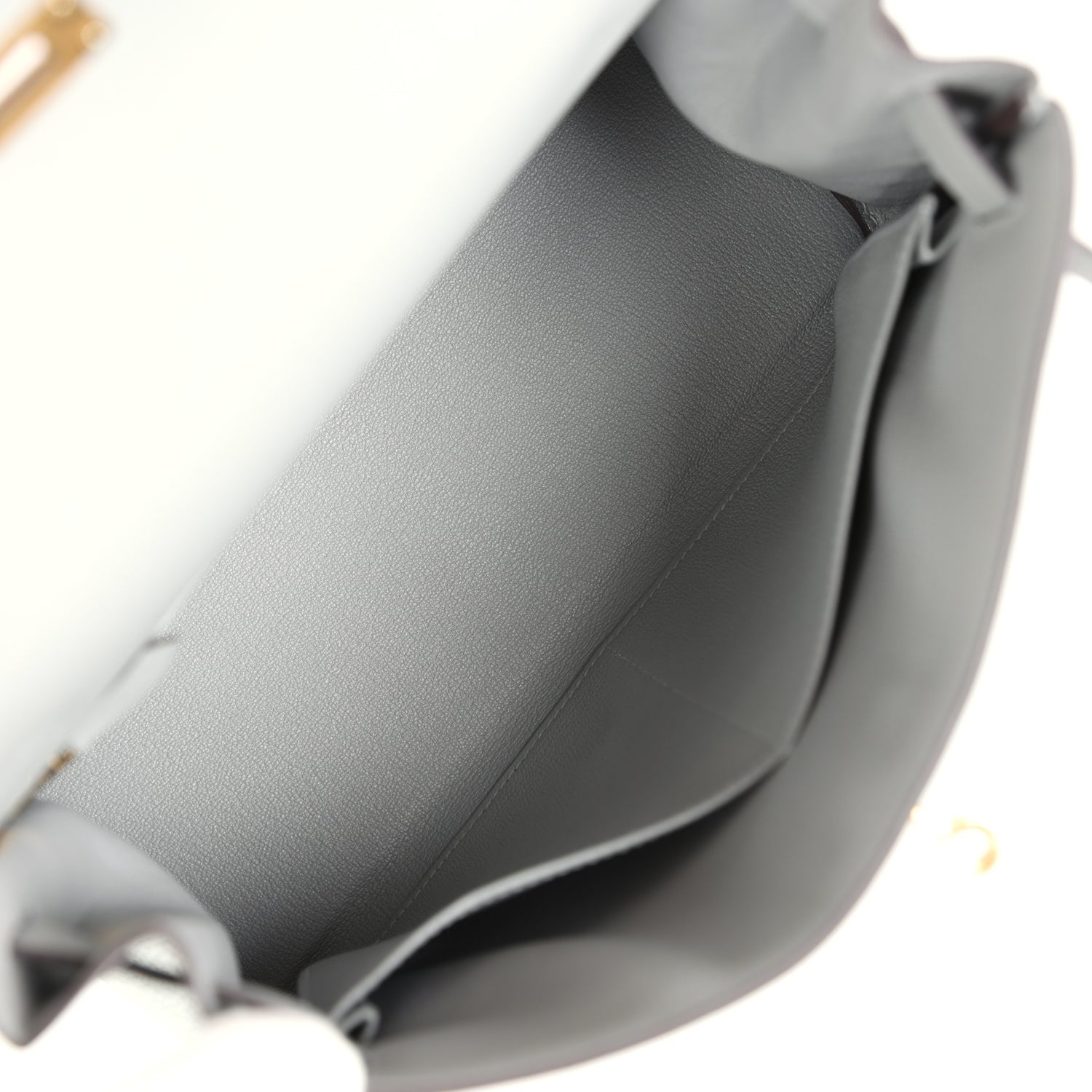 The interior is lined in Gris Mouette chevre and has one zip pocket with Hermès engraved pull and two open pockets on the opposite side.