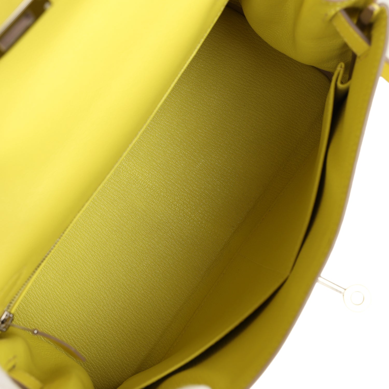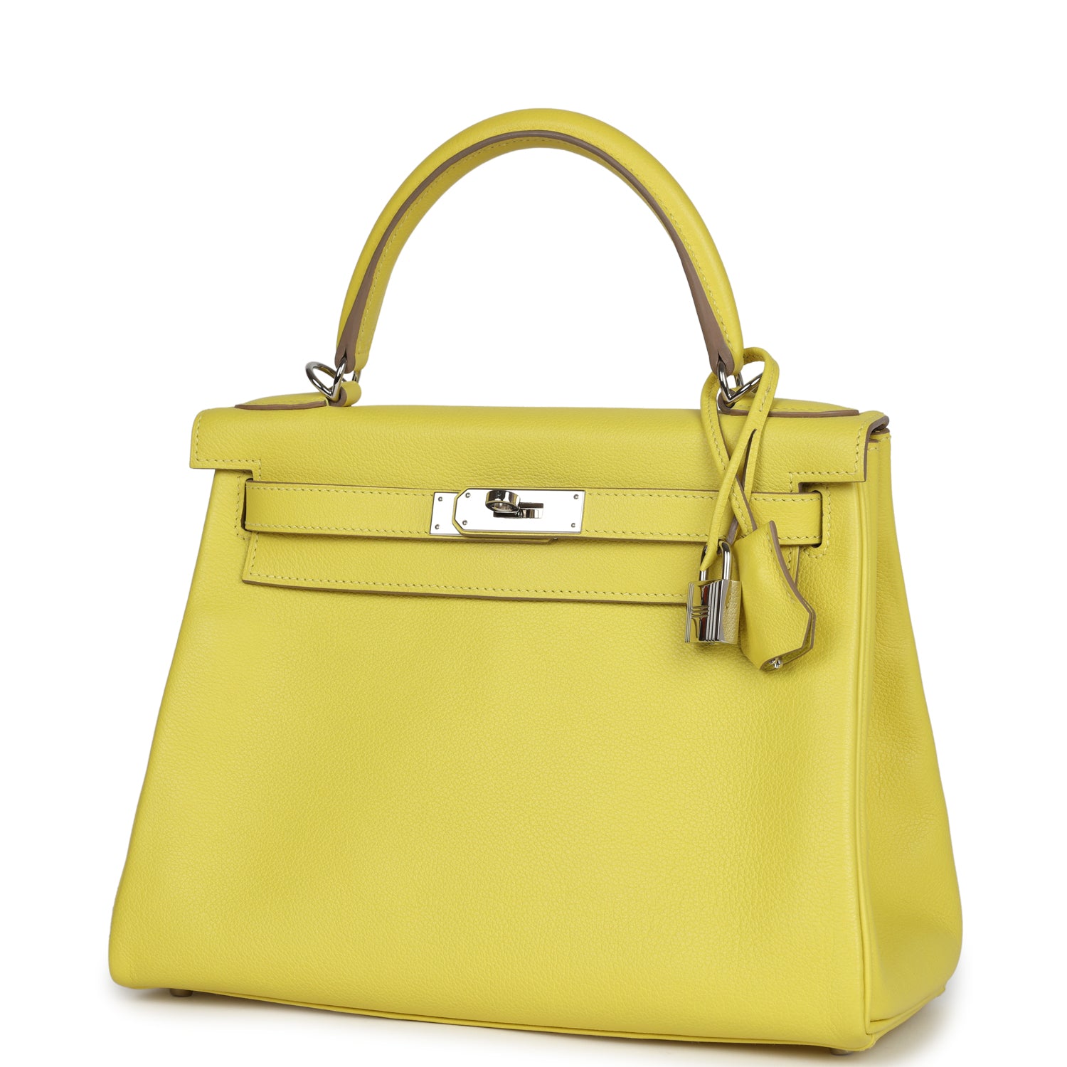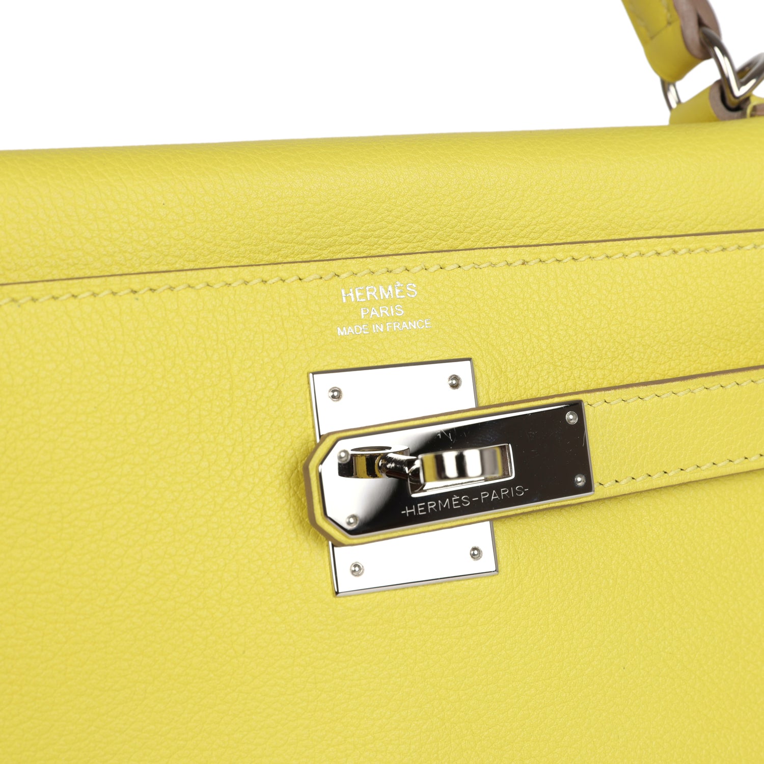 This Kelly, in the Retourne style, is in Lime evercolor leather with palladium hardware and has tonal stitching, front flap, two straps with center toggle closure, clochette with lock and two keys, single rolled handle and removable shoulder strap.