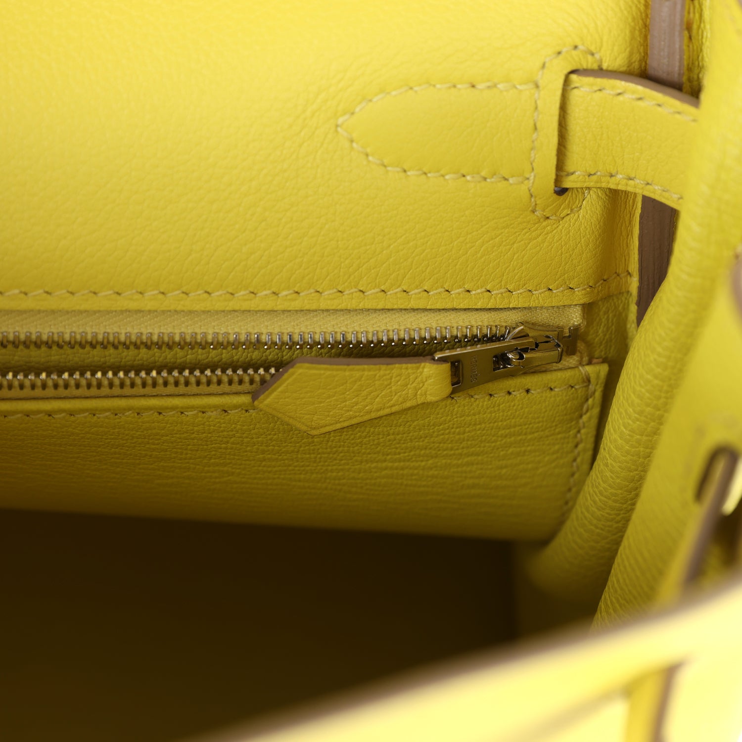 The interior is lined in Lime chevre and has one zip pocket with Hermès engraved pull and two open pockets on the opposite side.