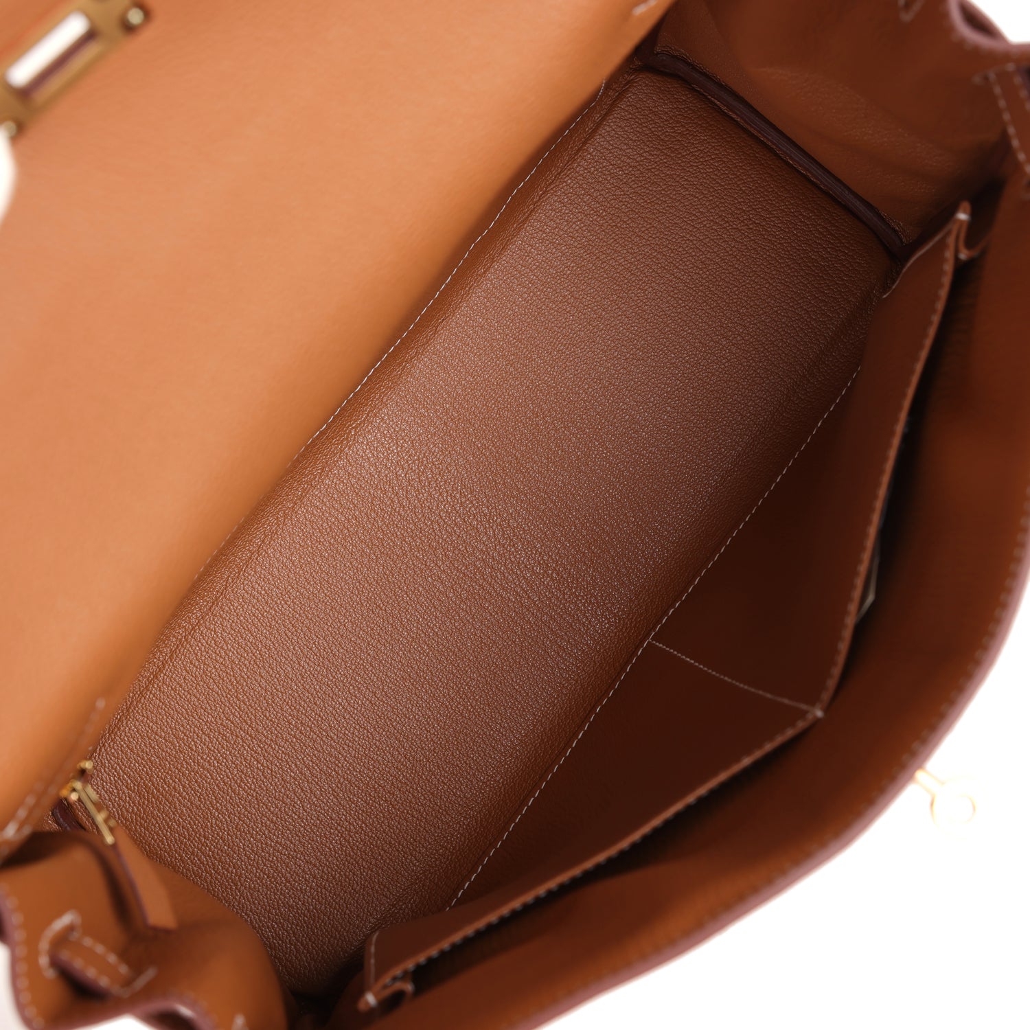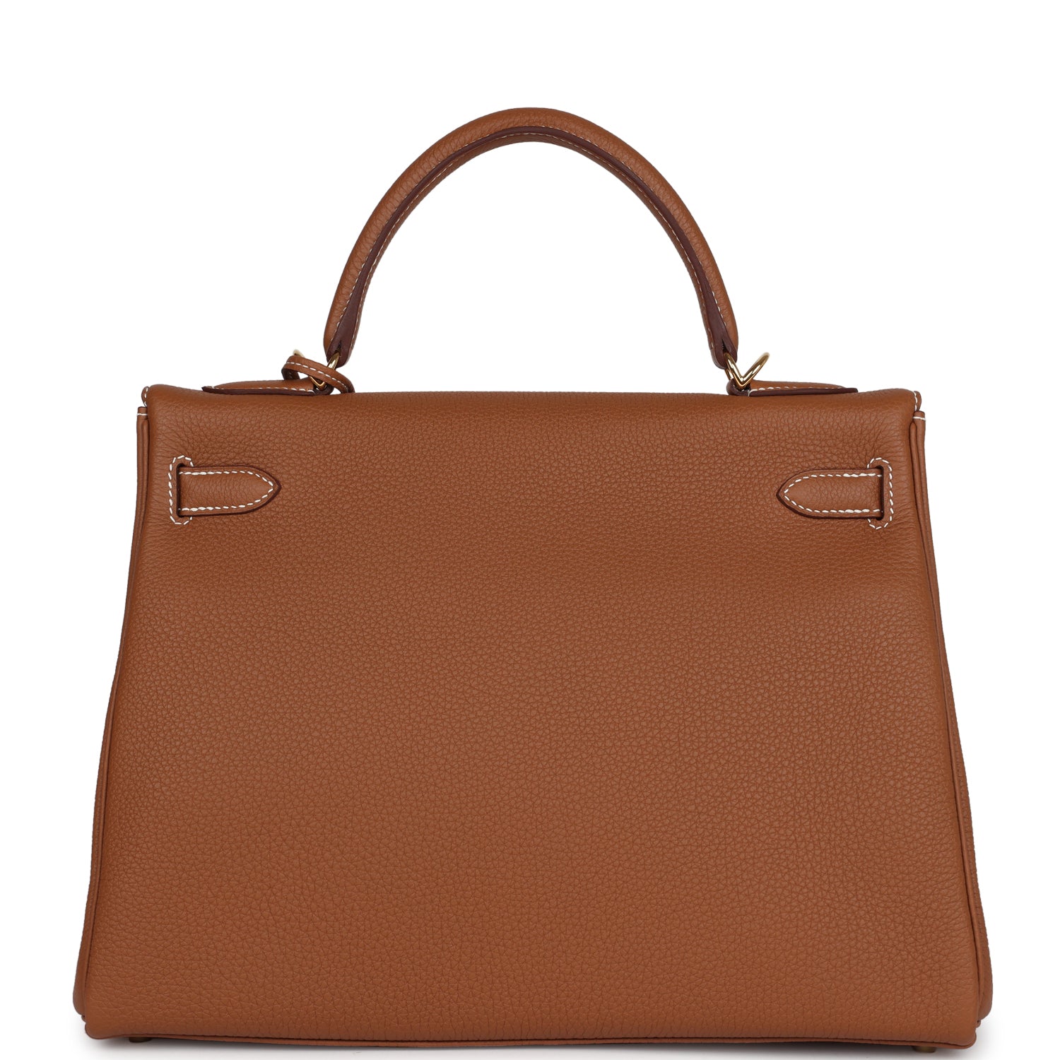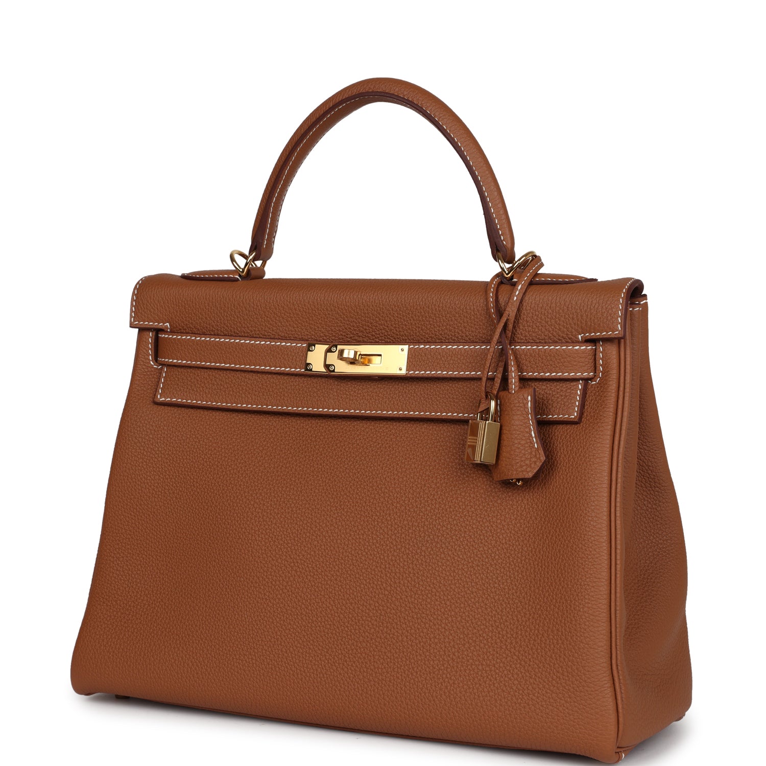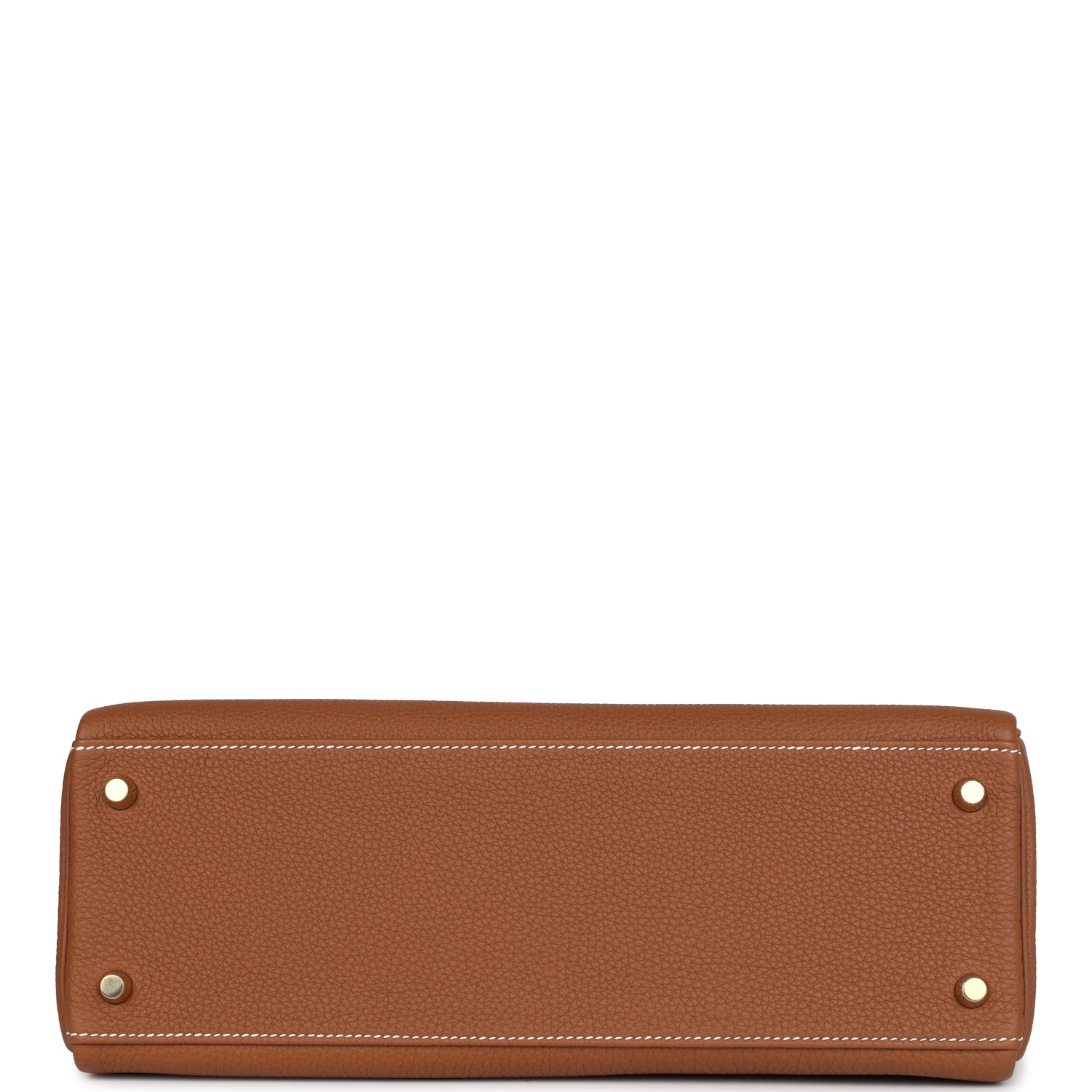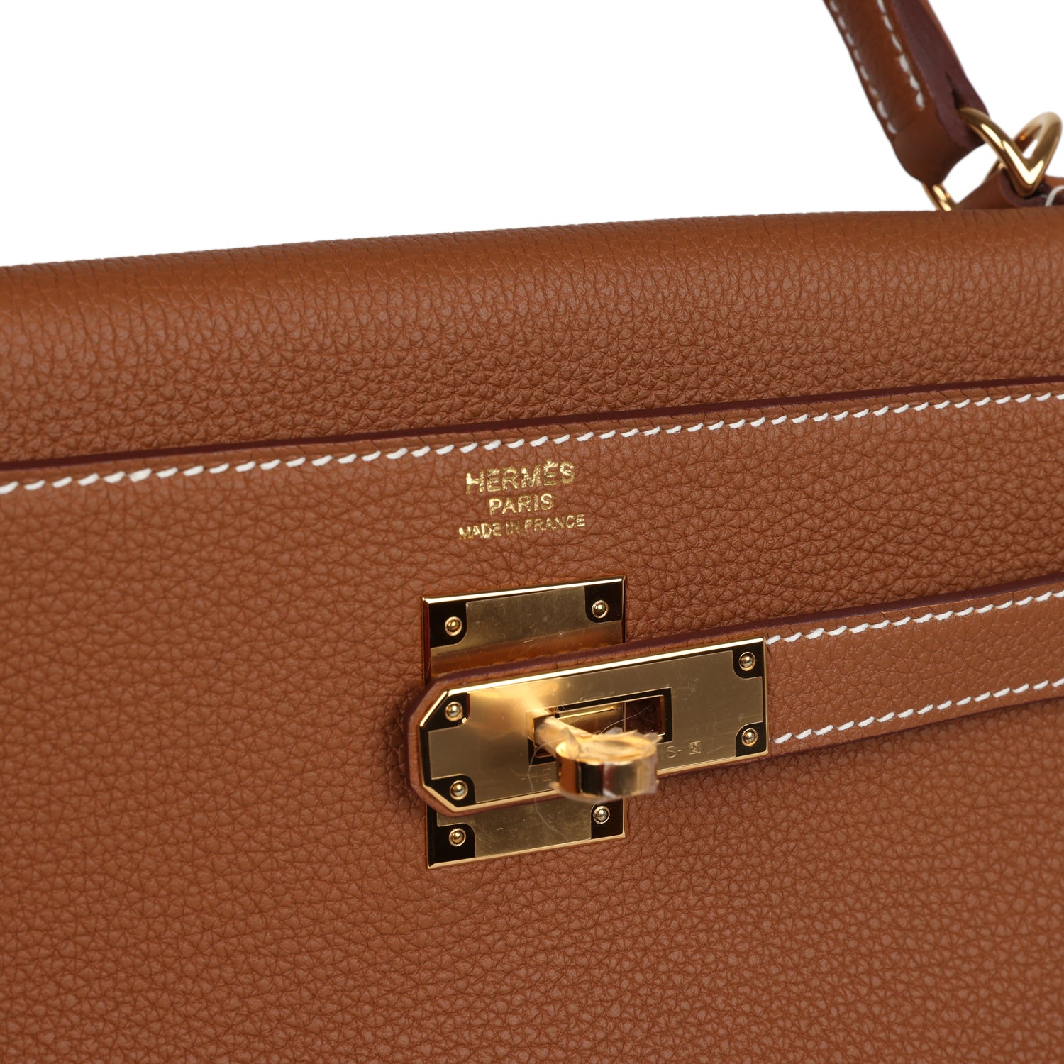 This Kelly, in the Retourne style, is in Gold togo leather with gold hardware and has contrast stitching, two straps with front toggle closure, clochette with lock and two keys, single rolled handle and removable shoulder strap.