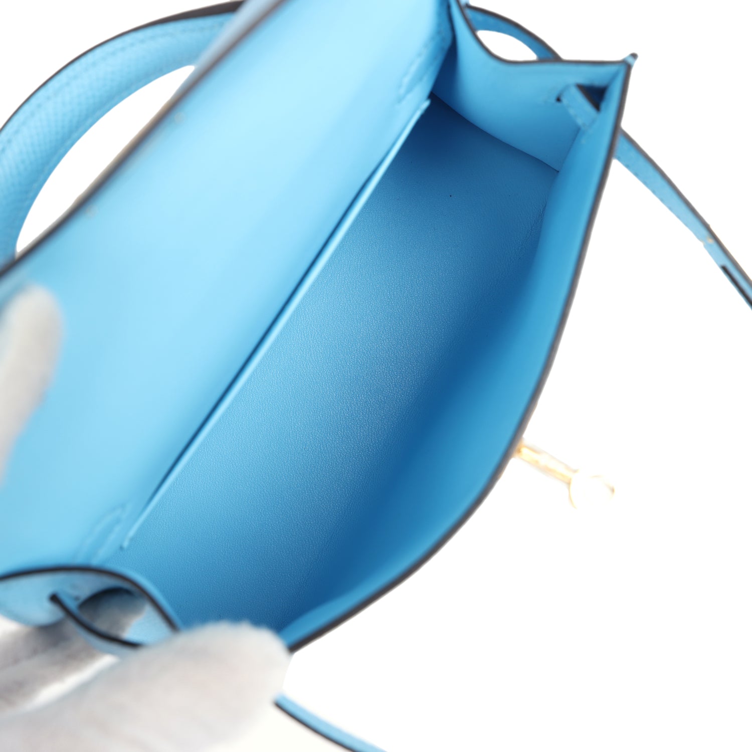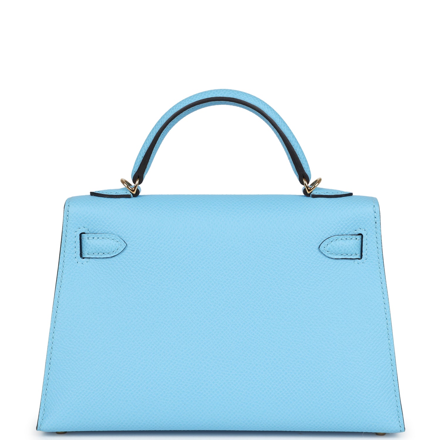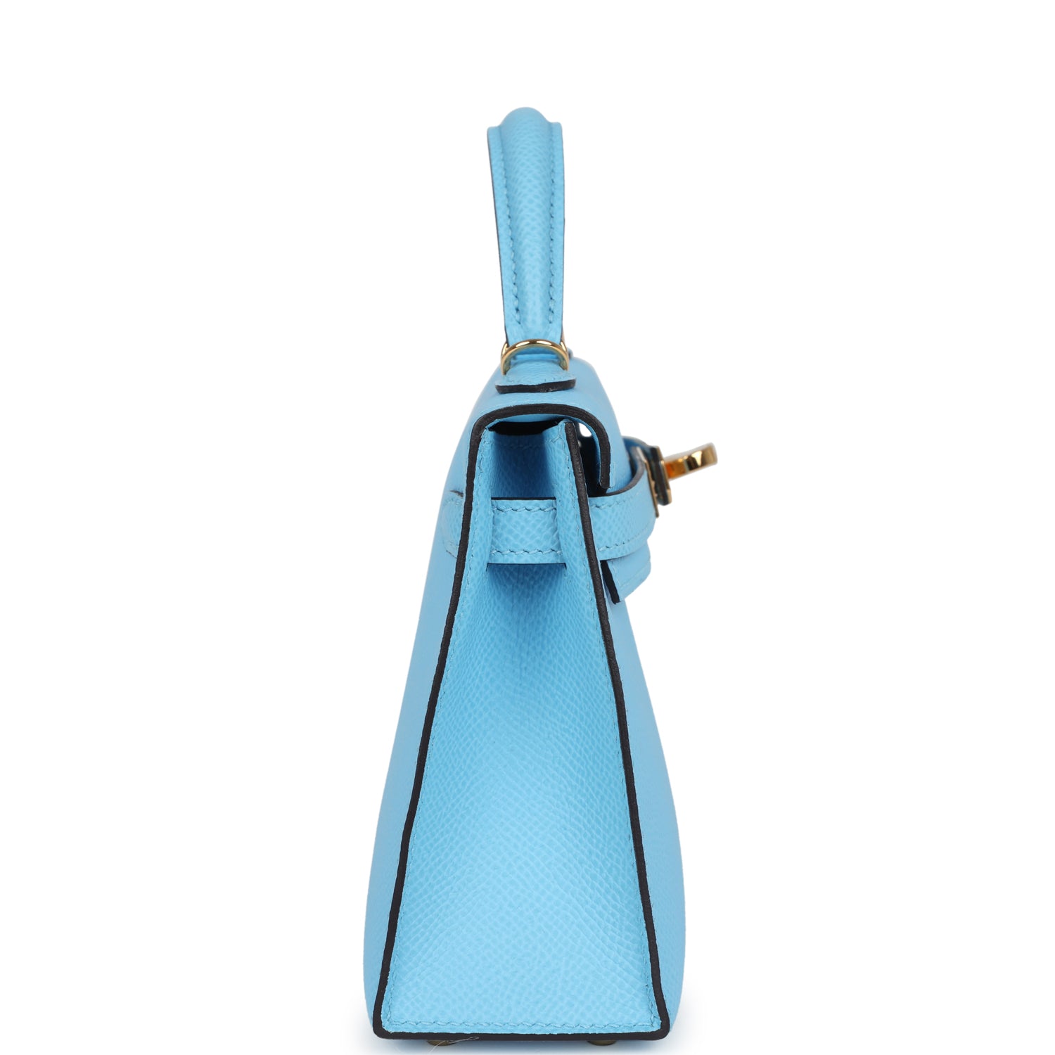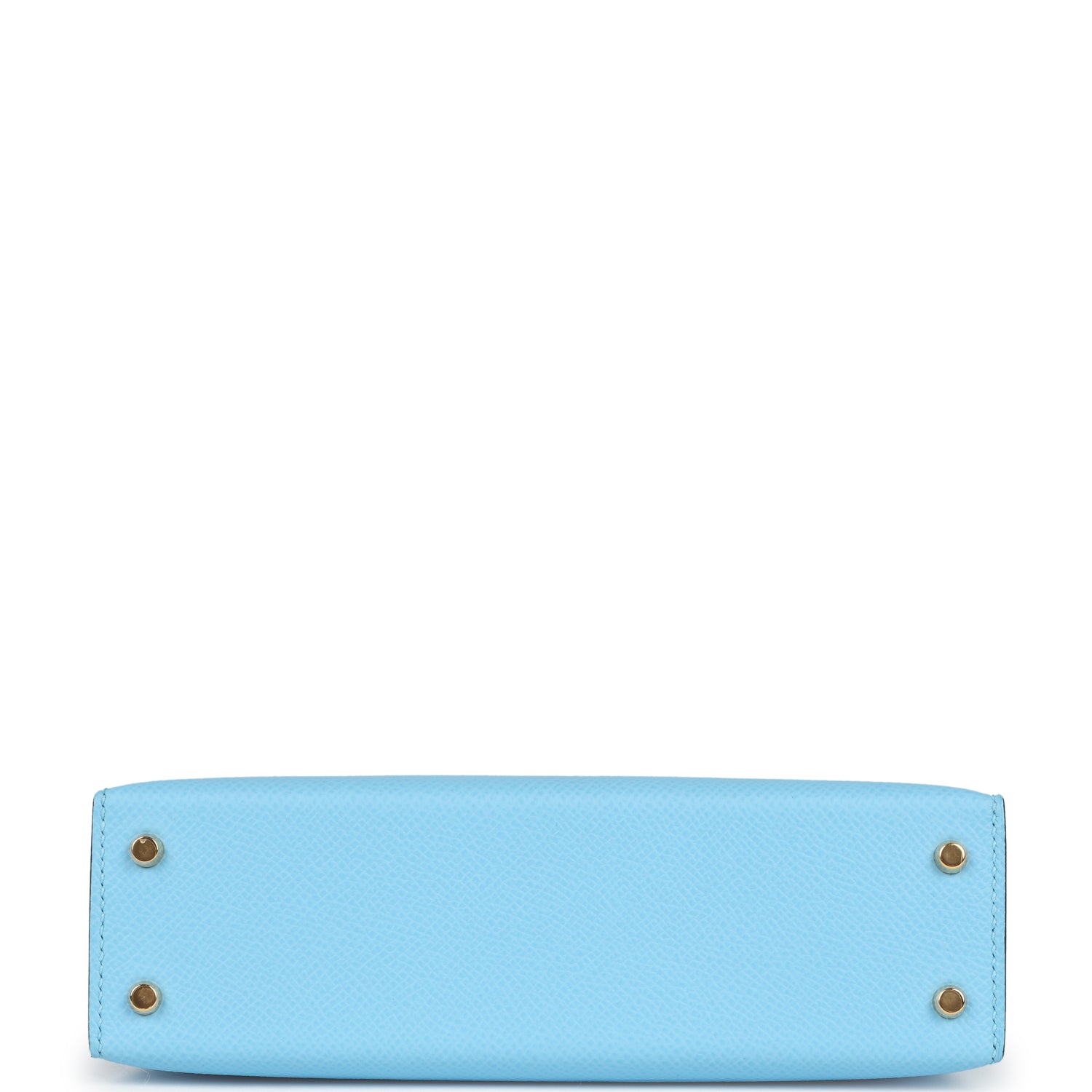 This Kelly, in the Sellier style, is inCeleste epsom leather with gold hardware andhastonal stitching, two straps with front toggle closure, single rolled handle and removable shoulder strap.