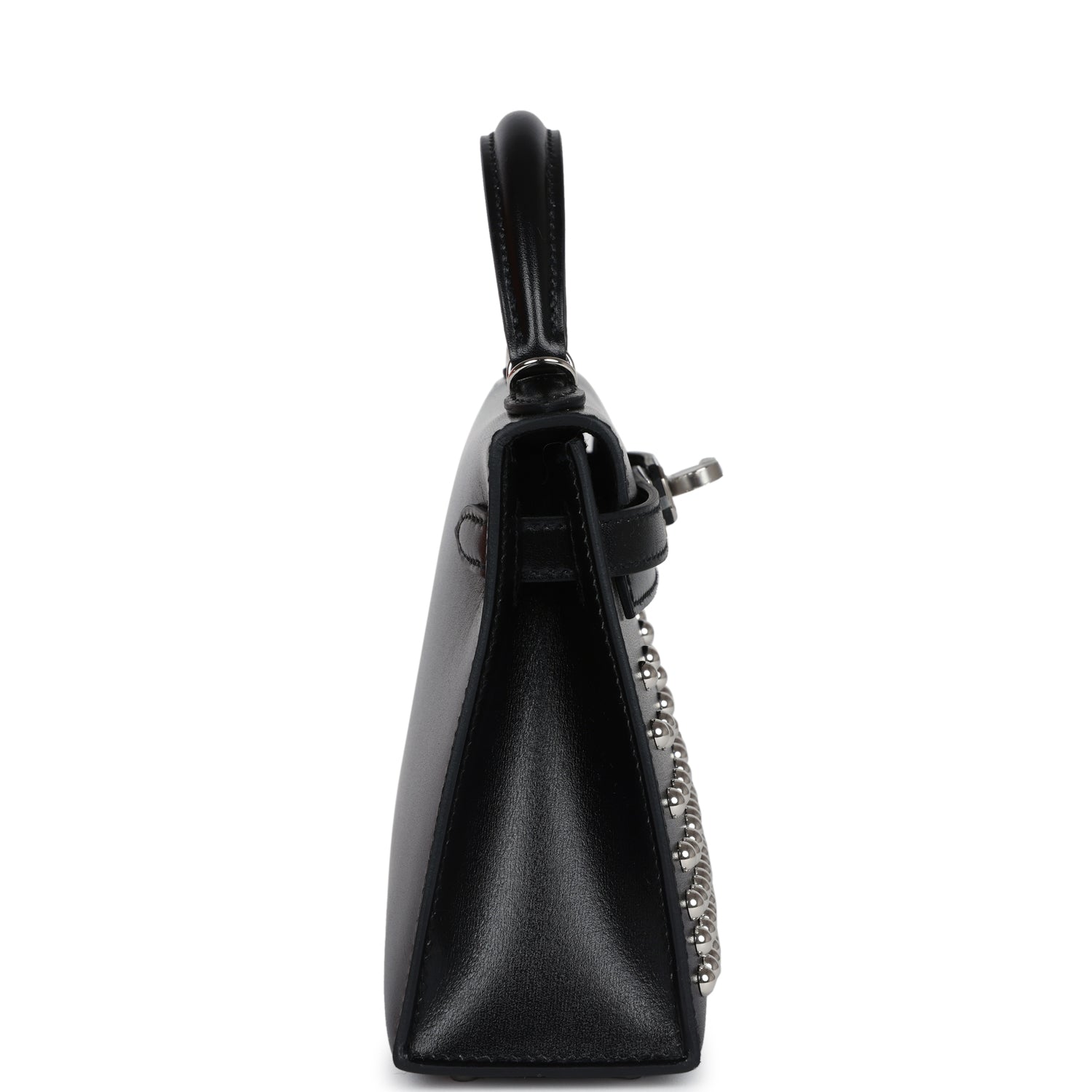 This limited edition Kelly, in the Sellier style, is in Black boxcalf leather with palladium hardware andhas palladium rounds studs, tonal stitching, two front straps with front toggle closure, single rolled handle and removable shoulder strap.