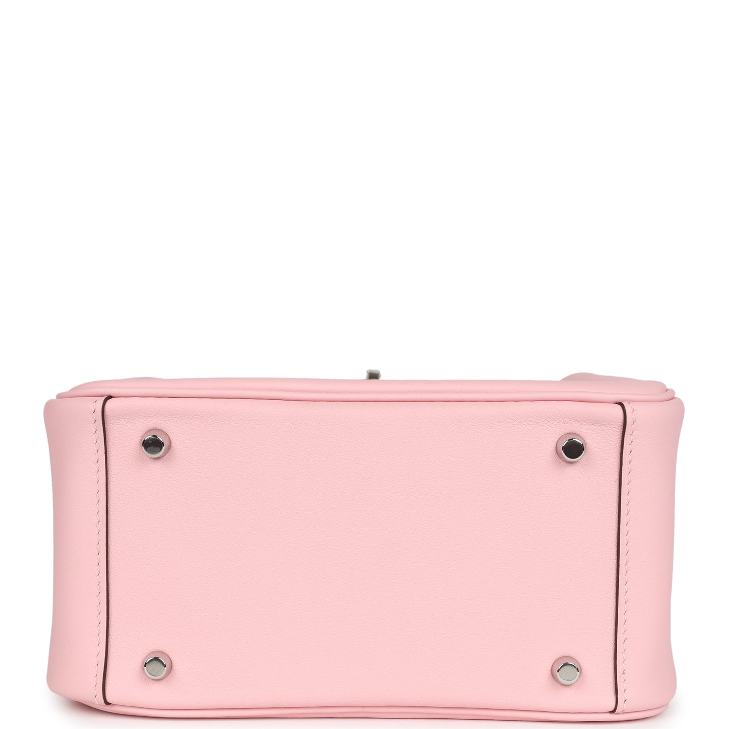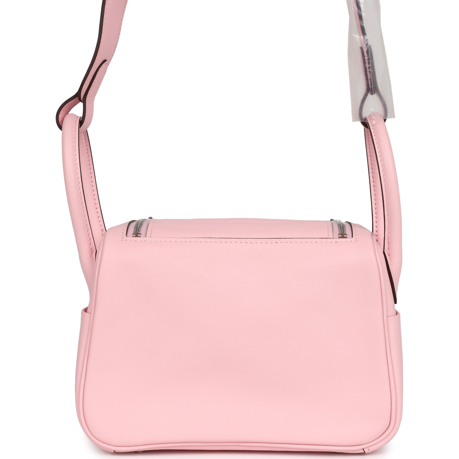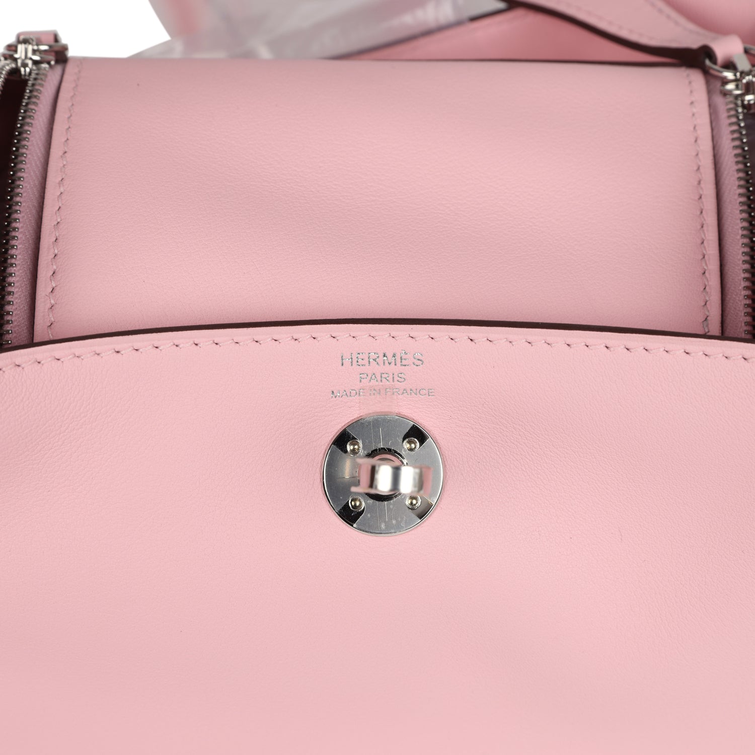 This Mini Lindy is in RoseSakura swift leather with palladium hardware and has tonal stitching, double zipper pulls, front Hermès twist lock, single pocket on each side, two rolled top handles linked by a flat shoulder strap.