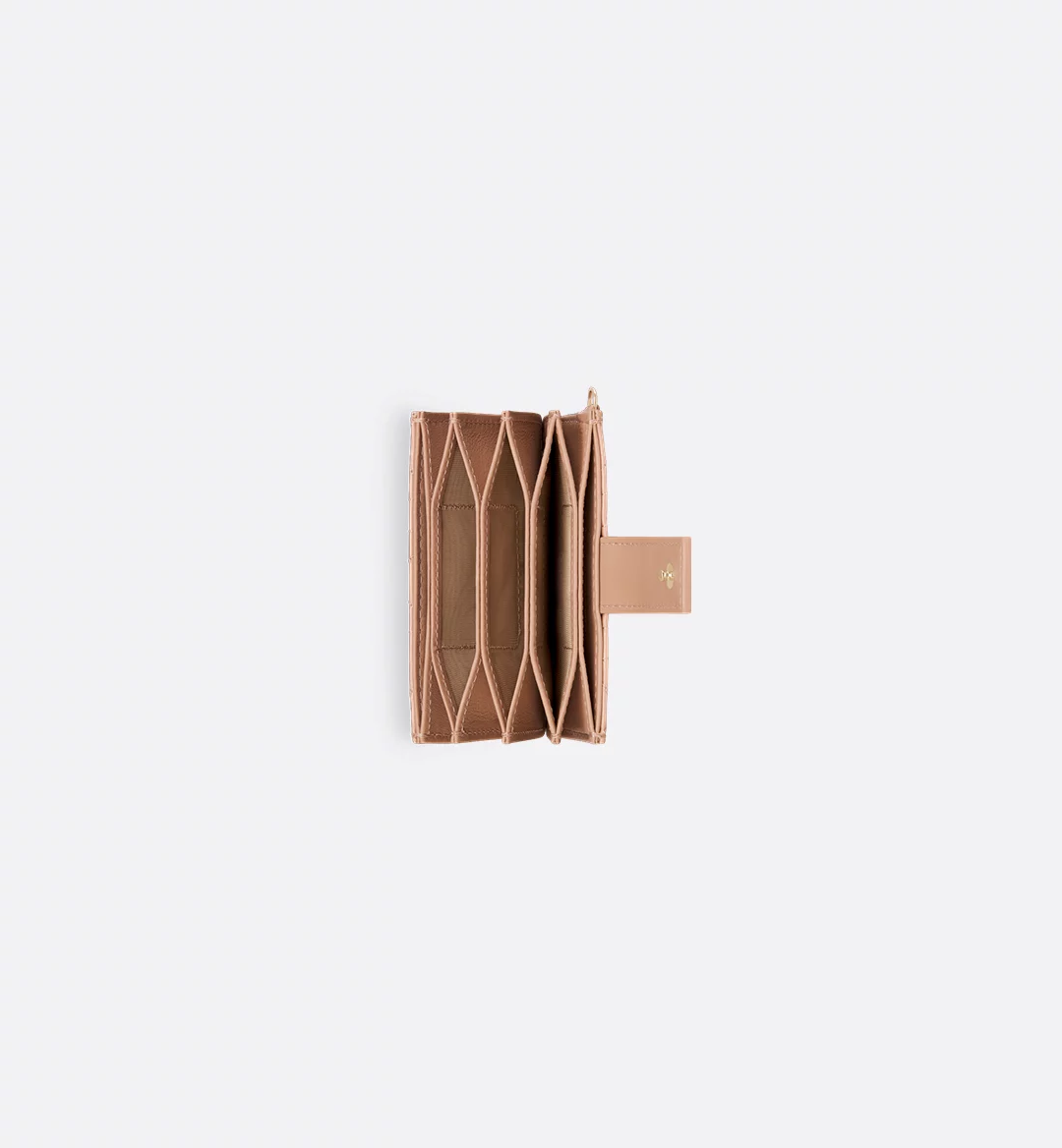 The Lady Dior Jasmine card holder pays tribute to the Dior leather artisans’ savoir-faire with its timeless Cannage topstitching. Crafted in Rose des Vents patent calfskin, the style is compact and functional and can accommodate the daily essentials. Embellished with detachable D.I.O.R. charms and a snap flap closure, the gusset card holder can be coordinated with other Lady Dior creations.