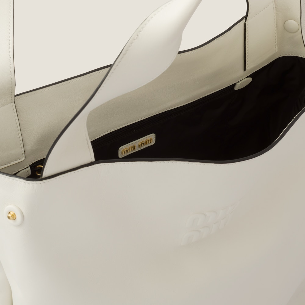 Cosmopolitan, versatile, and essential:the new leather hobo bag simultaneously displays classic allure and an expression of dynamic, ever-changing modernity. The embossed lettering logo decorates the design with iconic Miu Miu style while the Re-Nylon lining completes the aesthetic with a refined detail.