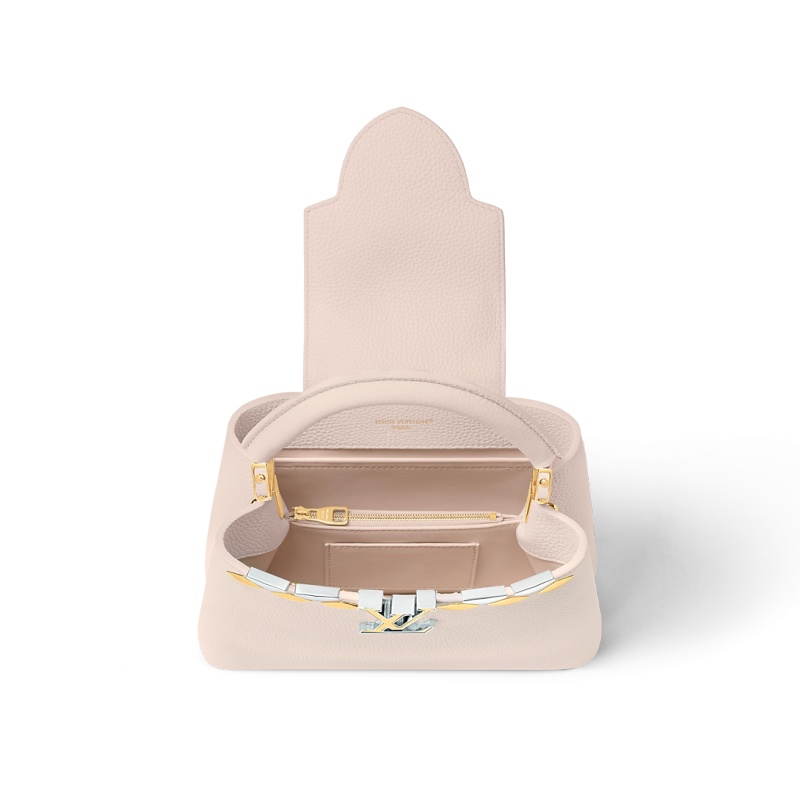 Offering a refined spin on the iconic Capucines BB, this sleek iteration is artfully embellished with a mixed-metal diamond-shaped Malletage crown, set against Taurillon leather. The double-carry design can be styled with the flap tucked inside or outside, and opens to reveal an organized interior with multiple pockets. Attach the adjustable strap to wear it cross-body or carry it by the top handle.