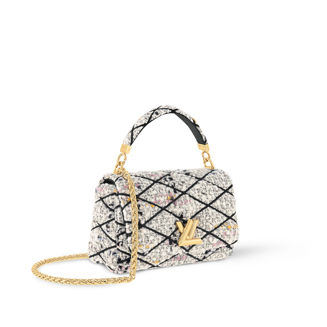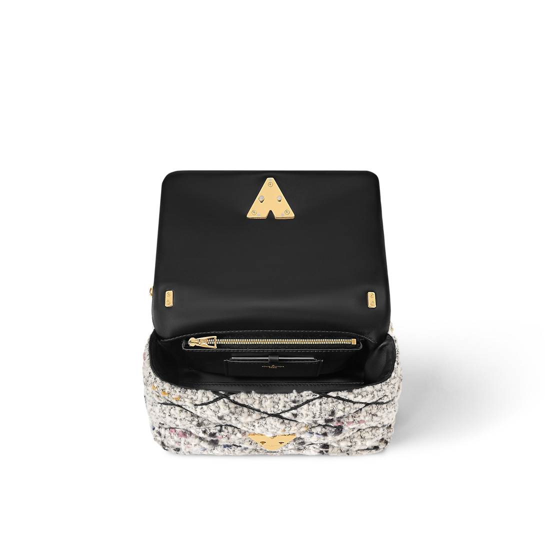 This GO-14 MM handbag in tweed with lambskin trim is a testament to the House’s technical excellence. The “malletage” motif, evocative of the quilted interiors of vintage Louis Vuitton trunks, is achieved through a unique leather-weaving technique. There’s a removable leather top handle and a detachable and adjustable sliding chain for shoulder wear.