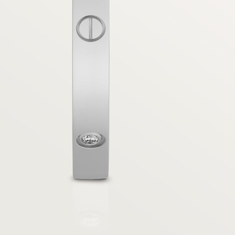 Product Description: LOVE bracelet Small model 18K white gold (750/1000) Set with 6 diamonds totaling 0.15 carats Width: 3.65 mm (for size 17) Thickness: 2.05 mm (for size 17) Its oval shape ensures a close but comfortable fit to the wearer??s wrist The locking mechanism consists of a single functional screw on one side of the bracelet and a hinge on the other Each LOVE bracelet is sold with a matching screwdriver specifically created for this piece To discover your recommended LOVE bracelet size please visit our Bracelet Sizing chart Add one centimeter to your size for a tight fit or two centimeters for a looser fit