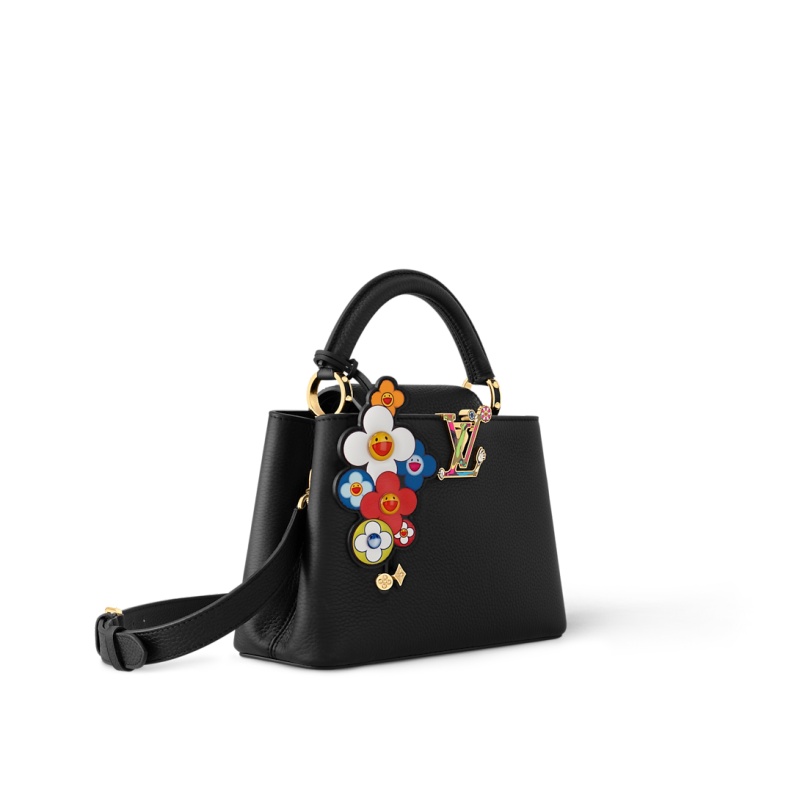 Bold signatures from the second edition of the Louis Vuitton x Murakami collection elevate the House’s iconic Capucines BB handbag into a playful statement. It exudes timeless House codes in Taurillon leather detailed with golden hardware, while the Japanese artist’s superflat style reimagines the emblematic LV Initials on the front and a cluster of Monogram Flowers that feature as a bag charm.