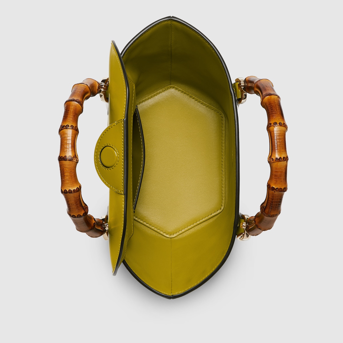 Introducing a bamboo top handle bag, this style from the women’s Fall Winter 2024 runway blends the House’s expert craftsmanship with its iconic motif. The basket-shaped bag reveals a hexagonal base, highlighting its artisanal construction. The mini size in pistacchio green is complete with a detachable shoulder strap.