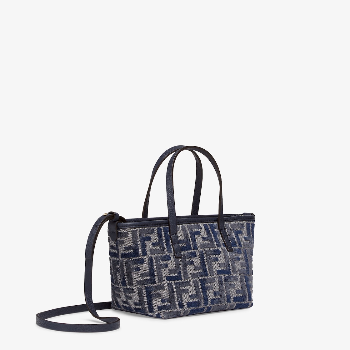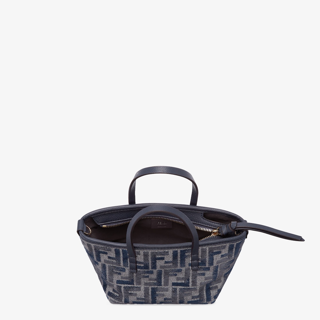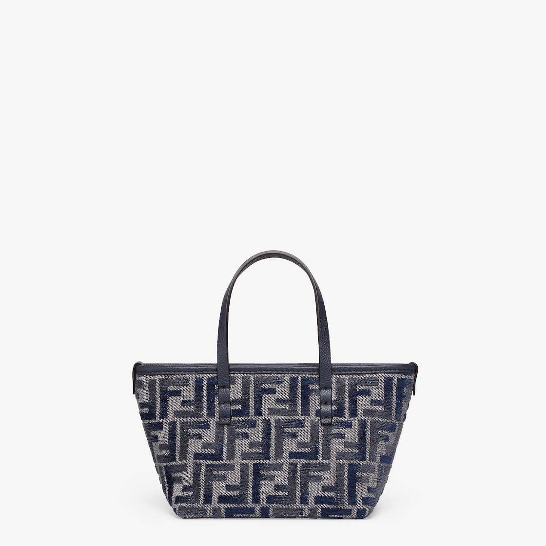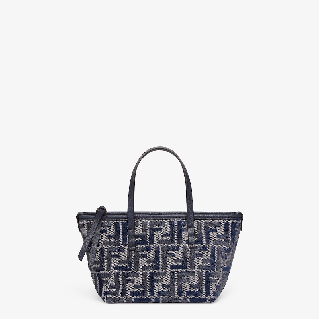 Made of chenille with the iconic FF motif in dark blue gradient tones, embellished with dark blue calfskin trimming. Zip closure with a long, knotted leather zip-pull.