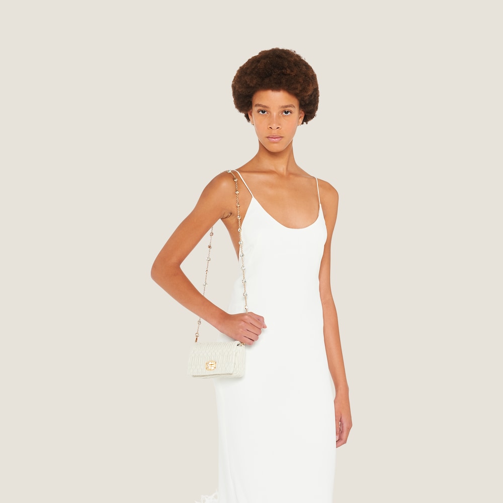Sparkling crystals embellish the chain shoulder strap and define the sophisticated design of the Miu Crystal nappa leather bag. The quilted motif adds an iconic note to the bag.