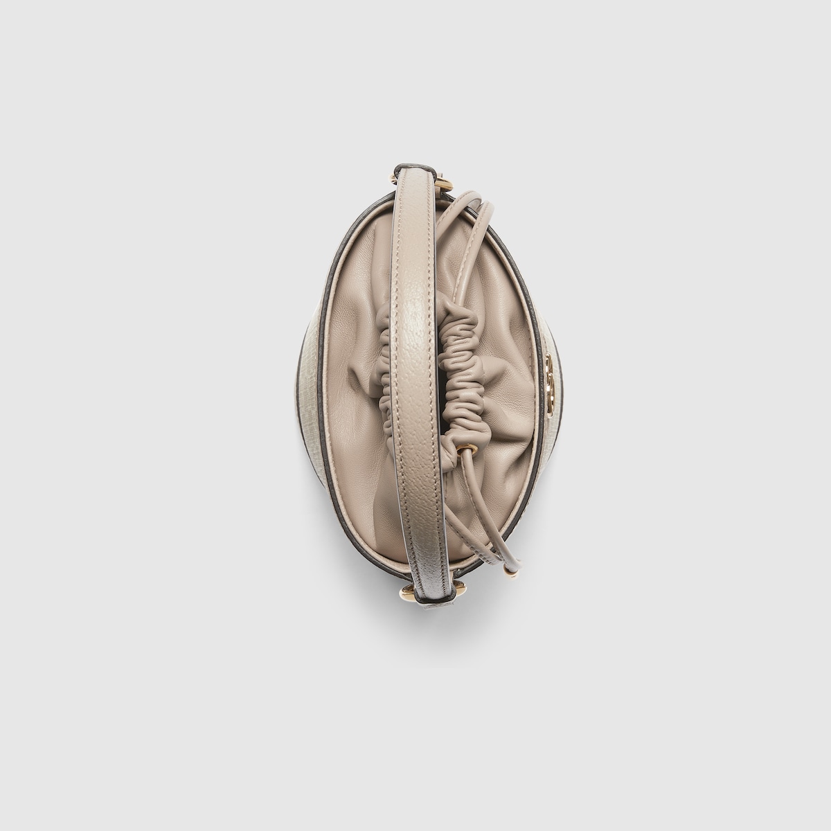 The Ophidia line is further elevated through new sizes and styles including variations with top handles as well as shoulder straps, allowing for versatile wear. The signature Double G hardware completes this mini bucket bag in a light gold against a beige and white GG Supreme canvas base.
