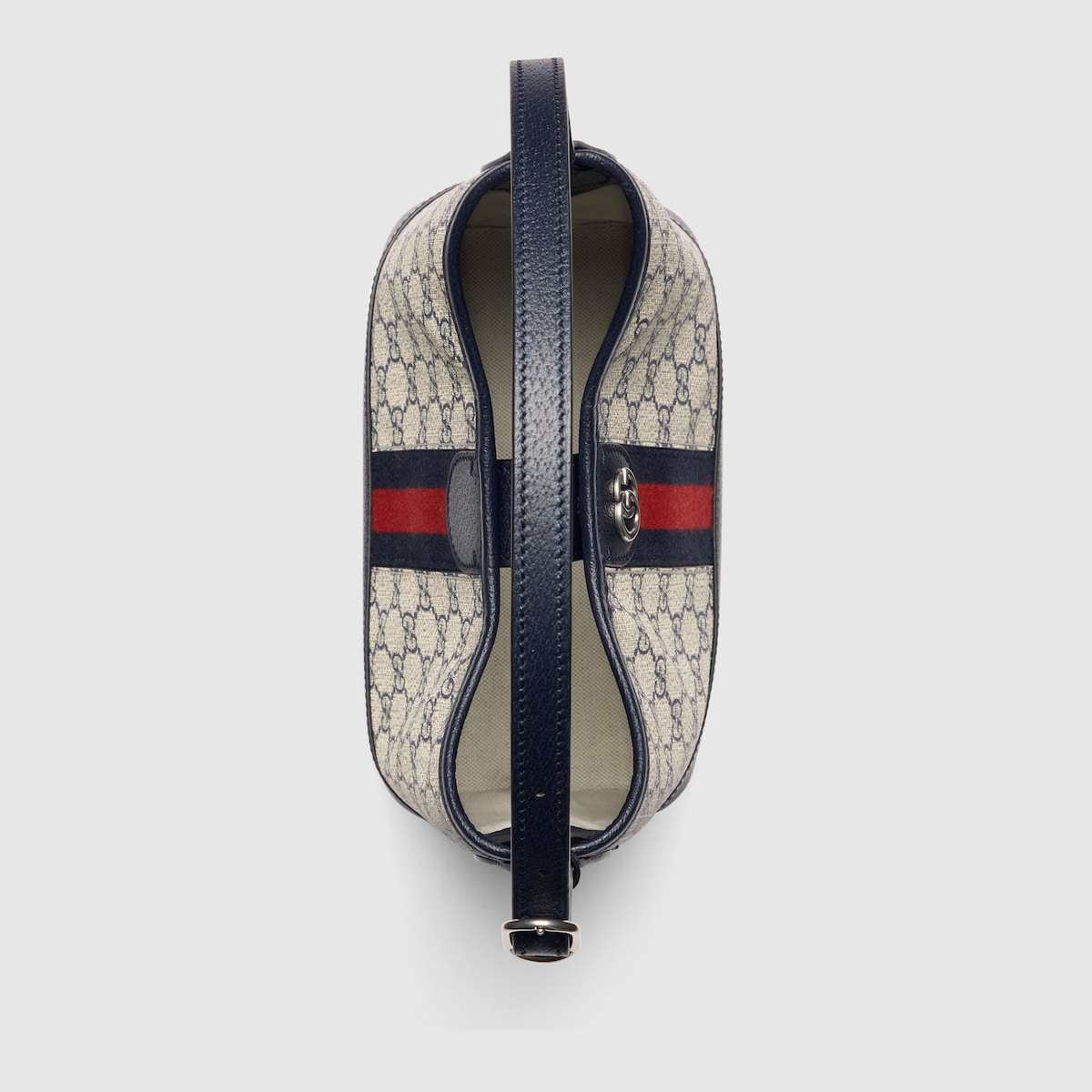 The Ophidia is reinvented in new and unexpected ways in this small-sized piece, which blends the open bucket design and shoulder bag style. It is crafted in the House’s signature GG Supreme canvas in the color combination of beige and blue.