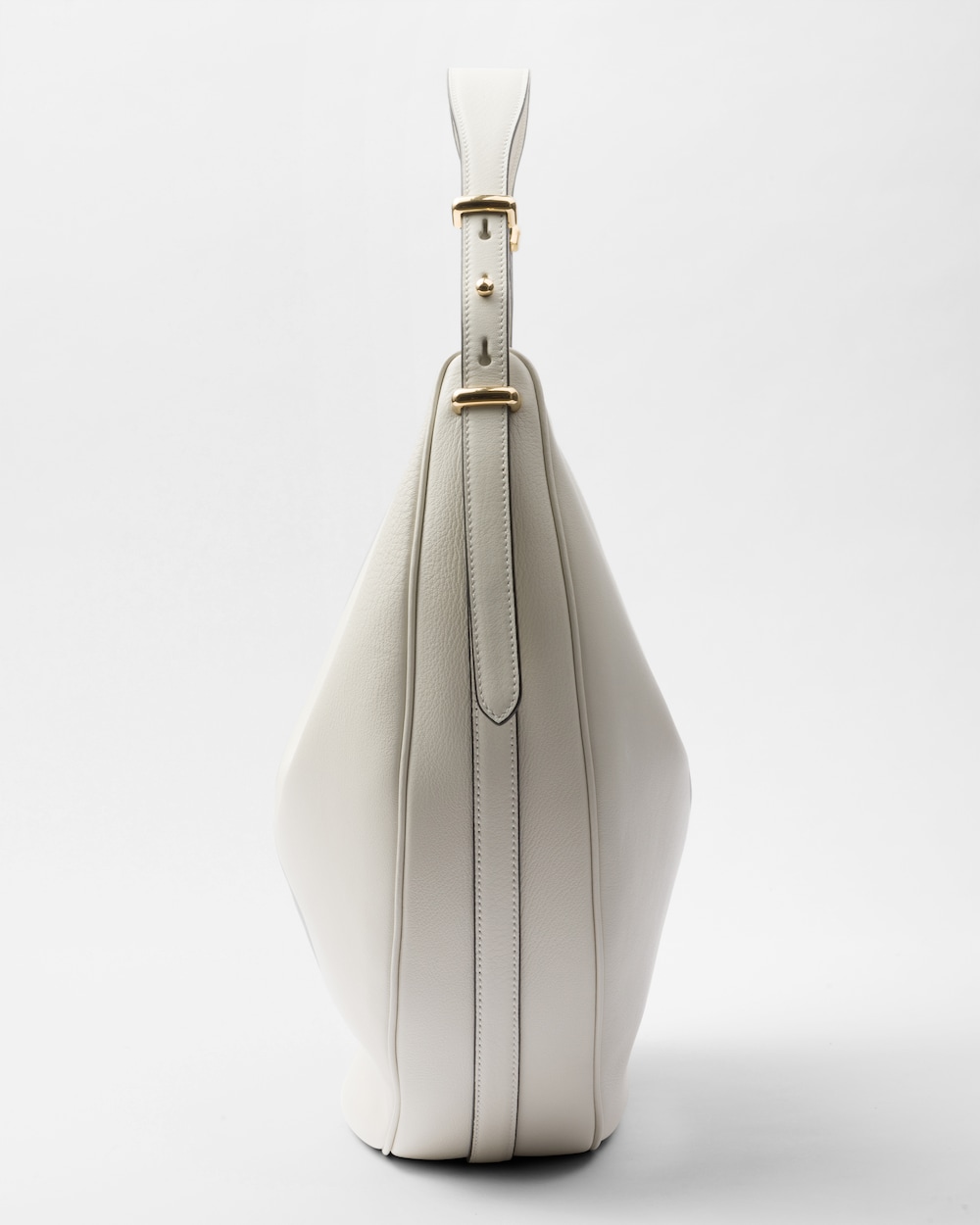The classic hobo bag is reinterpreted with a current design that plays with emphasized volumes and curvy lines. An extremely soft shape characterizes the roomy silhouette with adjustable handle, enriched with sleek details and brightened by metal hardware. The enameled metal triangle logo adds a distinctive signature touch to the versatile and contemporary accessory.