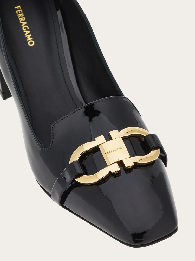 Made of high shine patent leather, this uptown ladies loafer is the symbol of contemporary elegance. The block heel and padded leather insole ensure absolute comfort while the golden Gancio buckle on the upper brings a touch of high end glam.