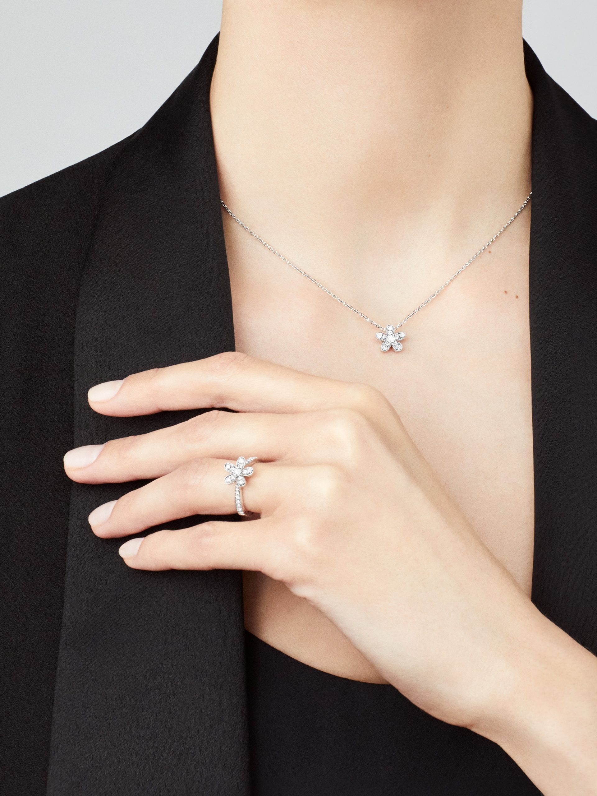 Socrate pendant, 1 flower, rhodium plated 18K white gold, round diamonds; diamond quality DEF, IF to VVS.The pendant is attached to the necklace’s chain STONE Diamond:11 stones, 0.3 carat SIZE Chain length:15.75 inches