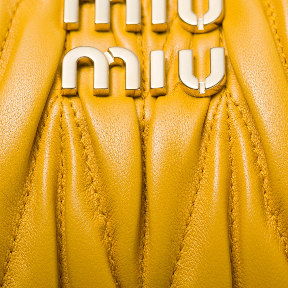 The Wander bag is reinterpreted season after season, becoming an iconic accessory of Miu Miu collections. Made of matelassé nappa leather, the bag is characterized by the sophisticated, three-dimensional effect created by the refined workmanship. The hobo shape, blending retro inspirations and contemporary elegance, becomes a new synonym of modern femininity.