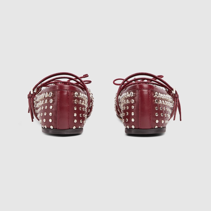 This iconic Horsebit ballet flat pays homage to the original ballet shoe silhouette defined by a squared tucked toe cap and the delicate bow detail. This style is crafted in Gucci Rosso Ancora red leather and defined by an allover studs detail. The ‘sacchetto’ construction ensures a high level of comfort, thanks also to the soft padded insole.