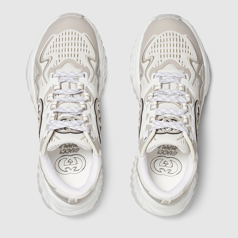 The Gucci Ripple sneaker features innovative stitching techniques which emulate the fluidity of water. The breathable mesh design is complete with three-dimensional elements which flow from the upper to the outsole, such as an Interlocking G leather patch with a 3D effect and a Gucci lettering metal hardware.