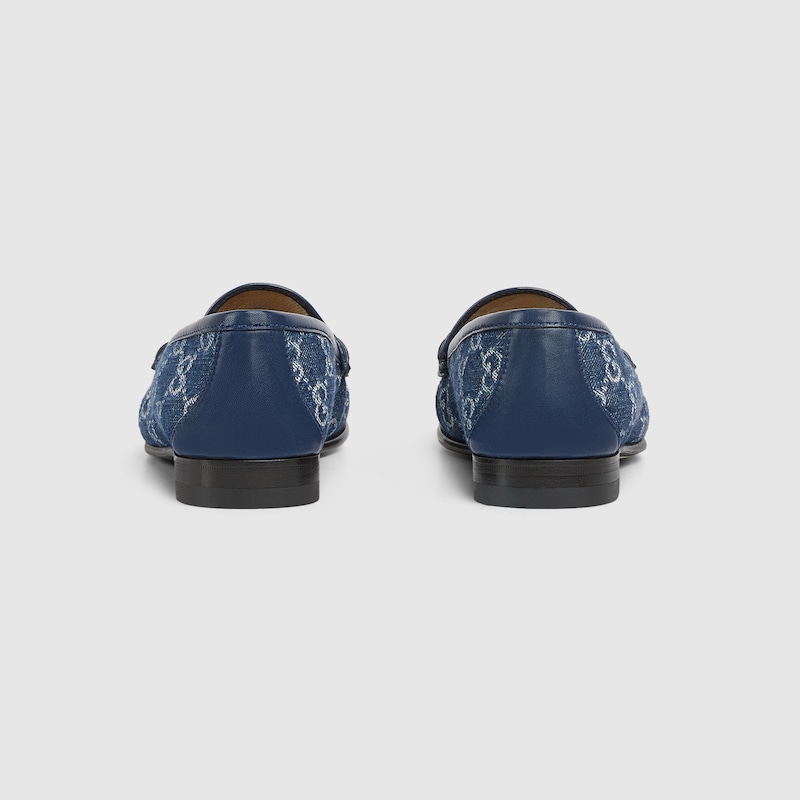 One of the House’s most signature styles, the Gucci loafer is presented here crafted in blue GG denim. The rounded shape mixes with a gold-toned Horsebit piece as a tribute to Gucci’s heritage.
